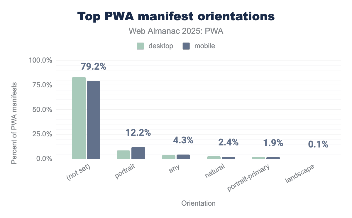 Unsurprisingly, around 79.2% of PWAs do not set orientation. Responsive design and modern development make defining the app’s orientation less necessary, but portrait takes second place with around 12.2%.