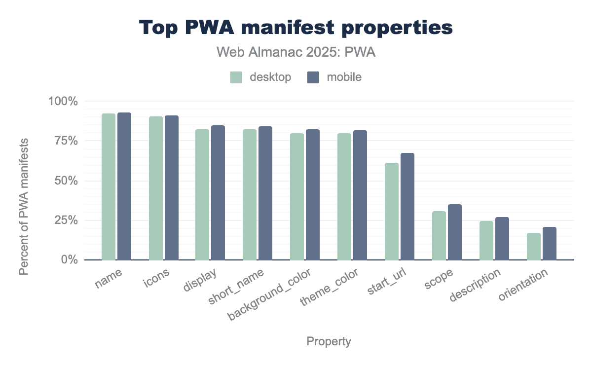 Straight up, these are the most used PWA manifest properties: name, icons, short_name, display and background_color. The top 4 most used properties are the same ones from 2022, with subtle notable changes regarding their order.