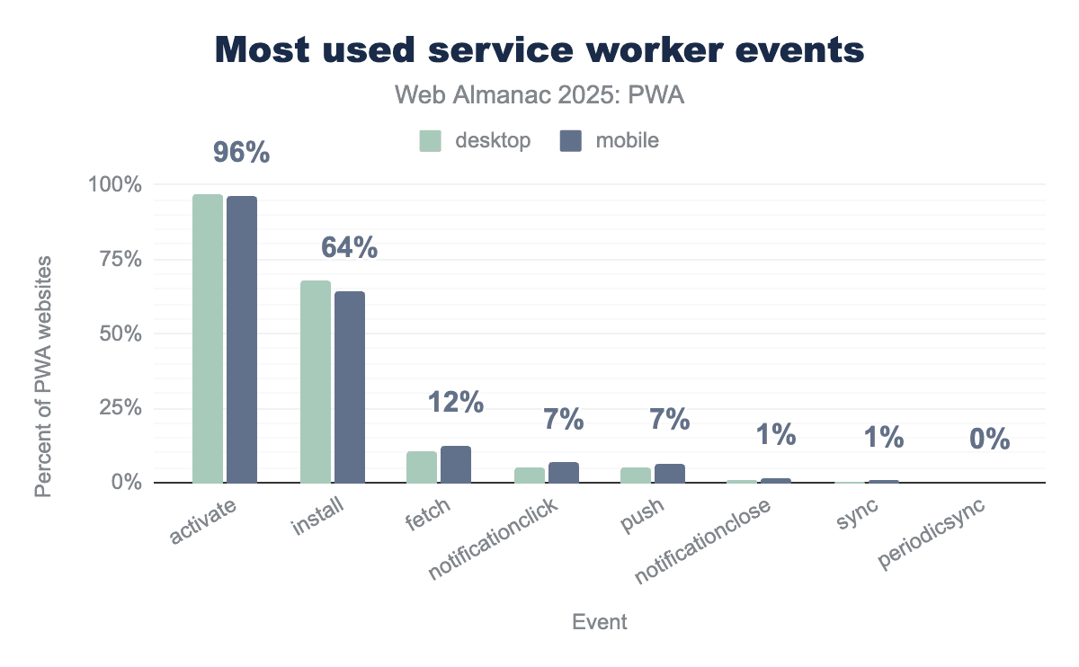 We’ve seen the latest data on what the most used service worker and manifest features are. In 2025, we can see that roughly one fifth of sites use service workers, and roughly one tenth use manifests.