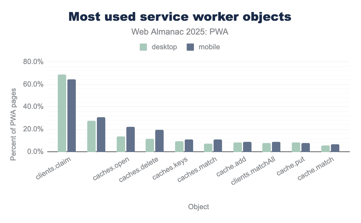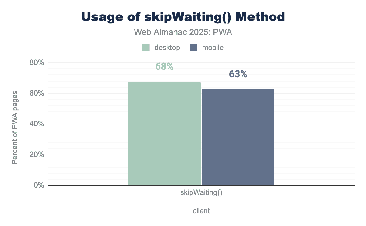 Looking at the most used service worker method, skipWaiting() has a notable use, with 68% usage on desktop and 63% on mobile. The browser will activate the service worker and replace the old one immediately. This implies developers are keen to ensure users don’t get stuck with stale assets. This is beneficial for applications that require frequent updates, like dashboards and messaging apps. It basically helps users get the latest version of the application right away.