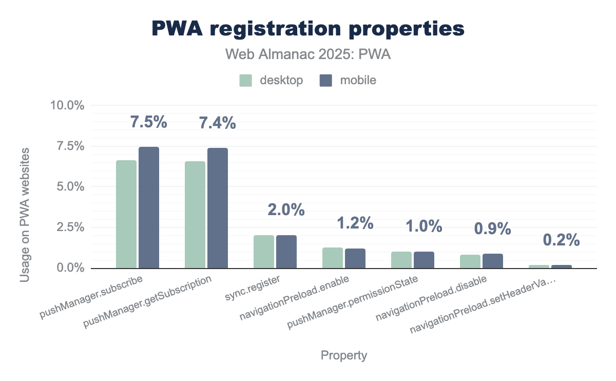 Diving deeper into service worker functionality, the data sheds some light into advanced capabilities that PWAs are using. For all PWAs using service workers across desktop and mobile, ~7% are registering for pushManager, 2% register for sync and 2% register for navigationPreload.