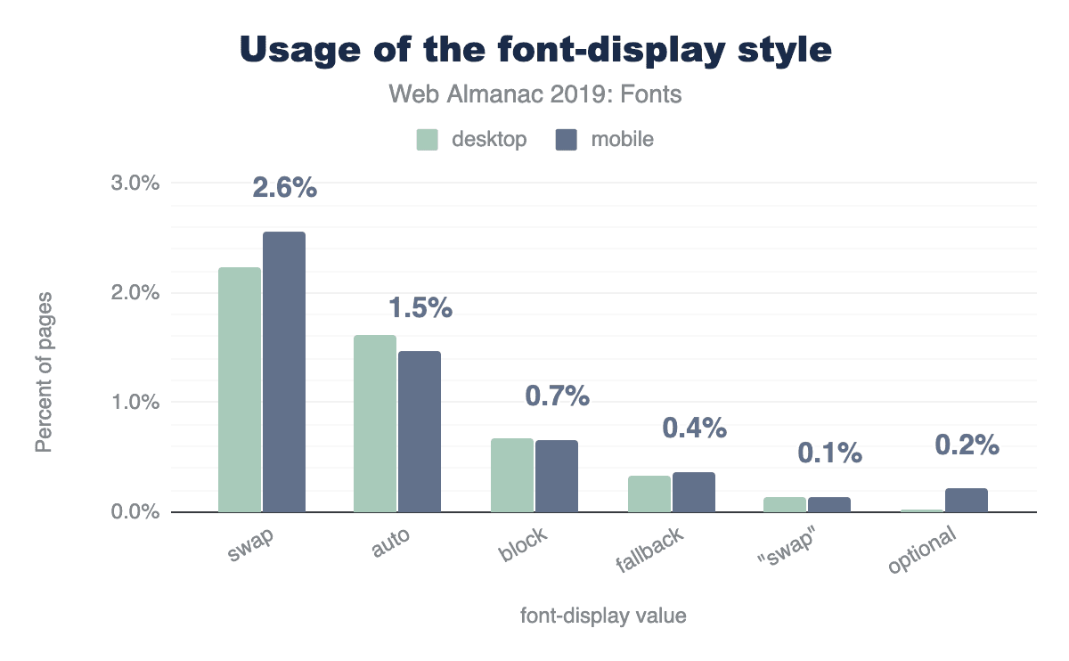 ウェブフォントの読み込み中にフォールバックテキストを表示する簡単な方法として、font-display: swapが最も一般的な値として君臨しています。swapは新しいGoogle Fontsのコードスニペットでもデフォルト値として使われています。いくつかの著名な開発者のエバンジェリストがこれを求めてちょっとした働きかけをしていたので、ここではoptional(キャッシュされた場合にのみレンダリングする)がもう少し使われることを期待していたのですが、駄目でした。