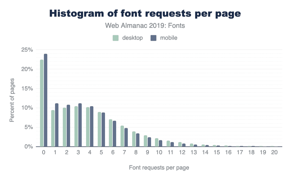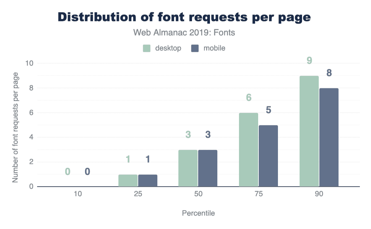 中央値のウェブページでは、3つのウェブフォントをリクエストしています。90パーセンタイルでは、モバイルとデスクトップでそれぞれ6つと9つのウェブフォントをリクエストしています。