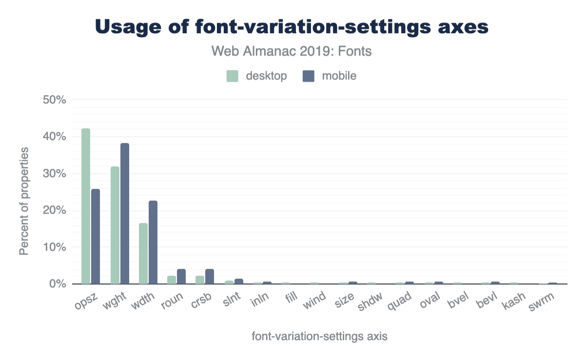 opszの値に設定されており、32%がwght、16%がwdth、2%以下がroun、crsb、slnt、inlnなどに設定されています。デスクトップページとモバイルページで顕著な違いは、opszの使用率が26%、wghtの使用率が38%、wdthの使用率が23%となっており、wghtの使用率は、wghtの使用率とwghtの使用率の差が大きい。font-variation-settings 軸の使用法。