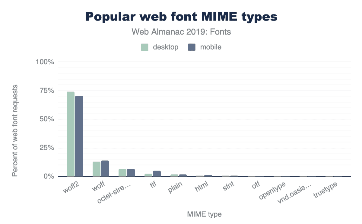 第3位のoctet-stream(およびもう少し下のplain)は、多くのウェブサーバが不適切に設定されており、ウェブフォントファイルのリクエストで誤ったMIMEタイプを送信していることを示唆しているように見えます。