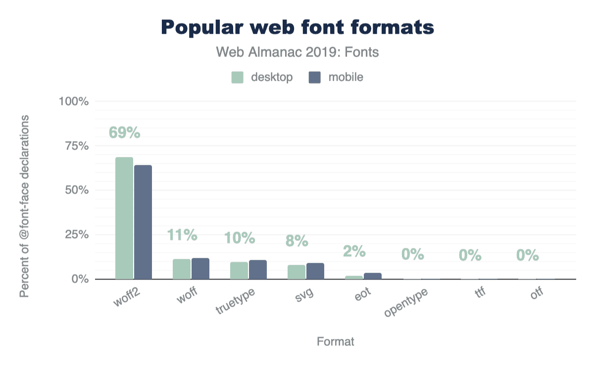 @font-face 宣言におけるフォントフォーマットの人気度。