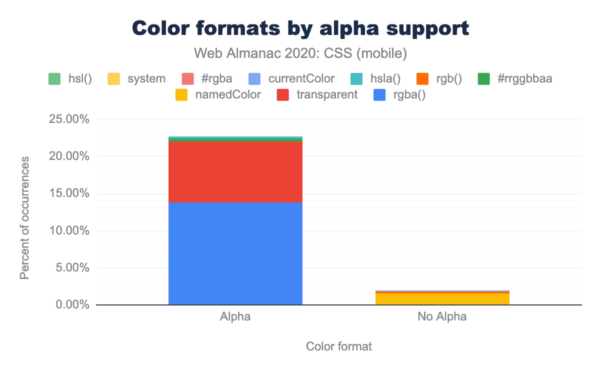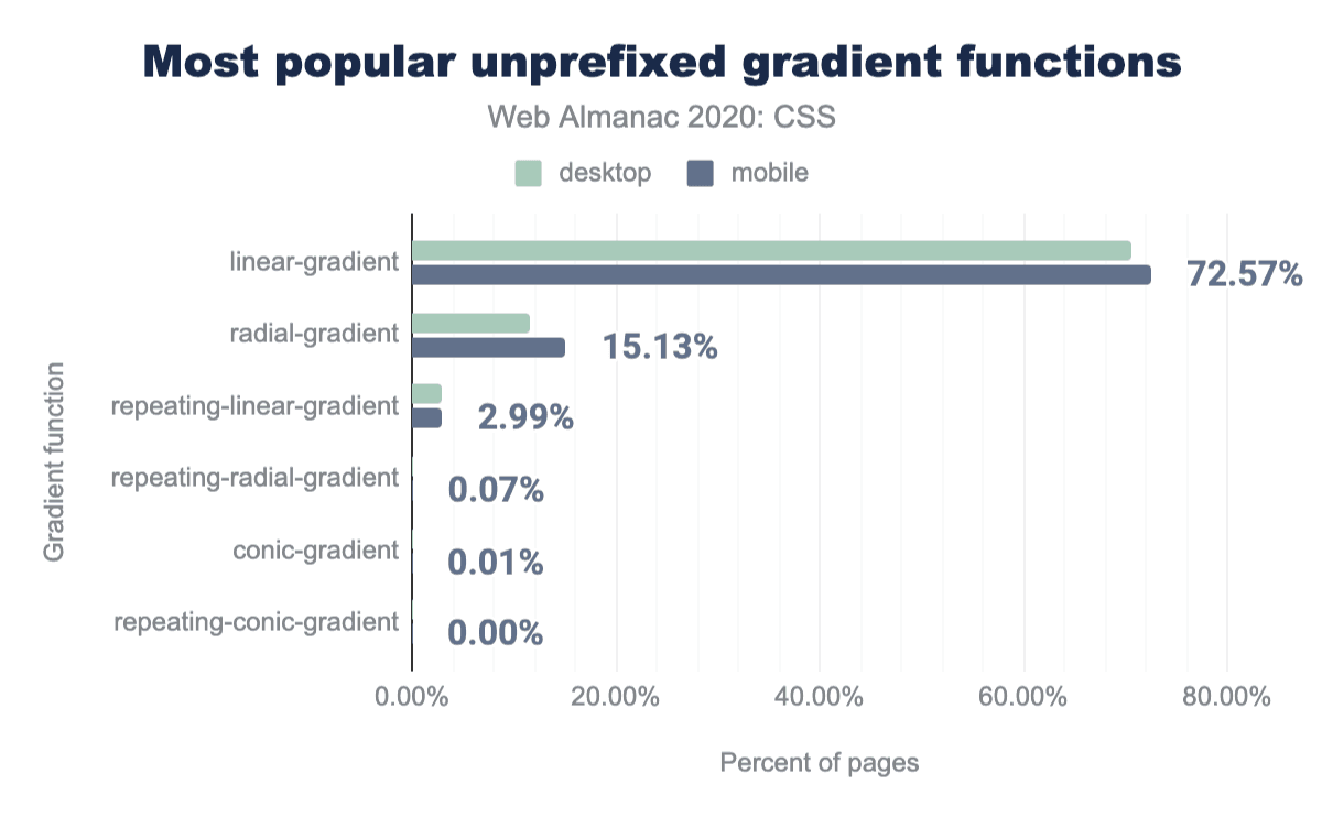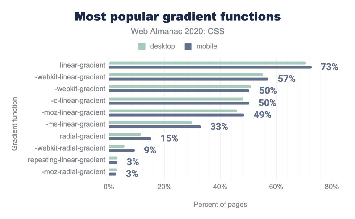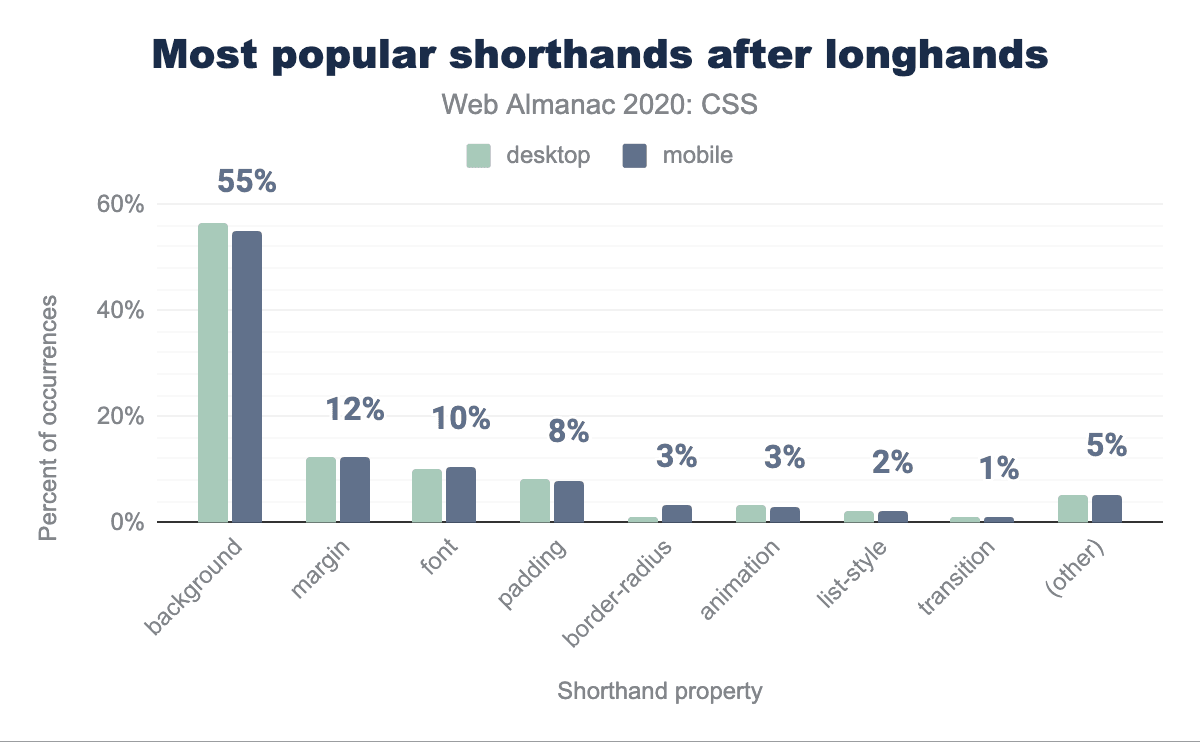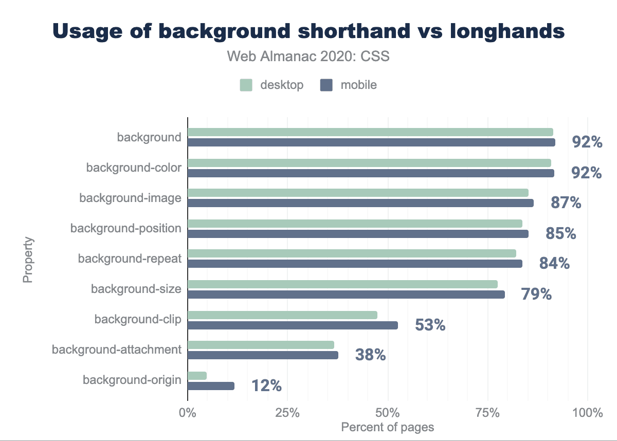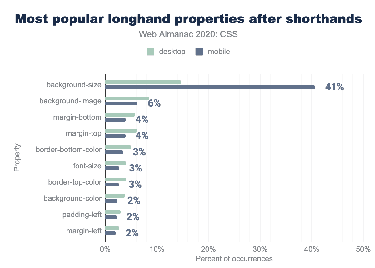 最も古い通常の記載の一つであるbackgroundもまた、非常によく使われており、92%のページで10億回使用されています。しかし、これは開発者がすべての構文を使いこなせているわけではありません:backgroundのほぼすべて(90%以上)は非常にシンプルなもので、1つか2つの値を持つものです。それ以上のものについては、ロングハンドの方がわかりやすいと考えられています。