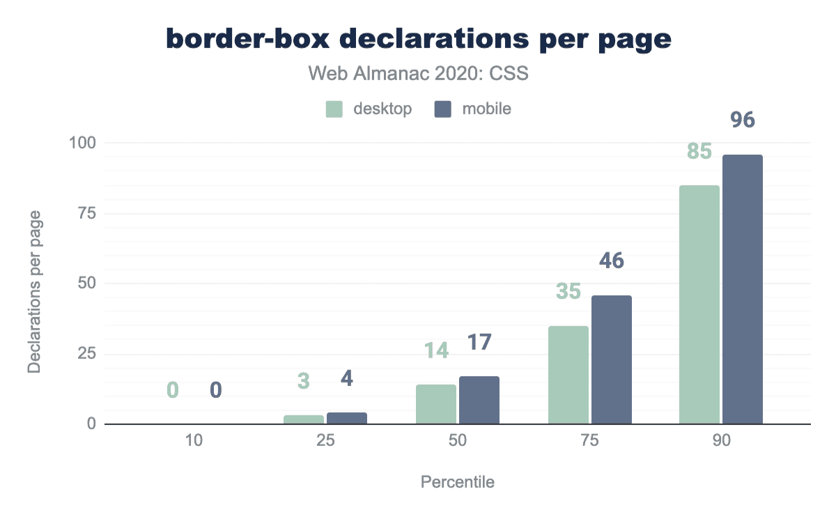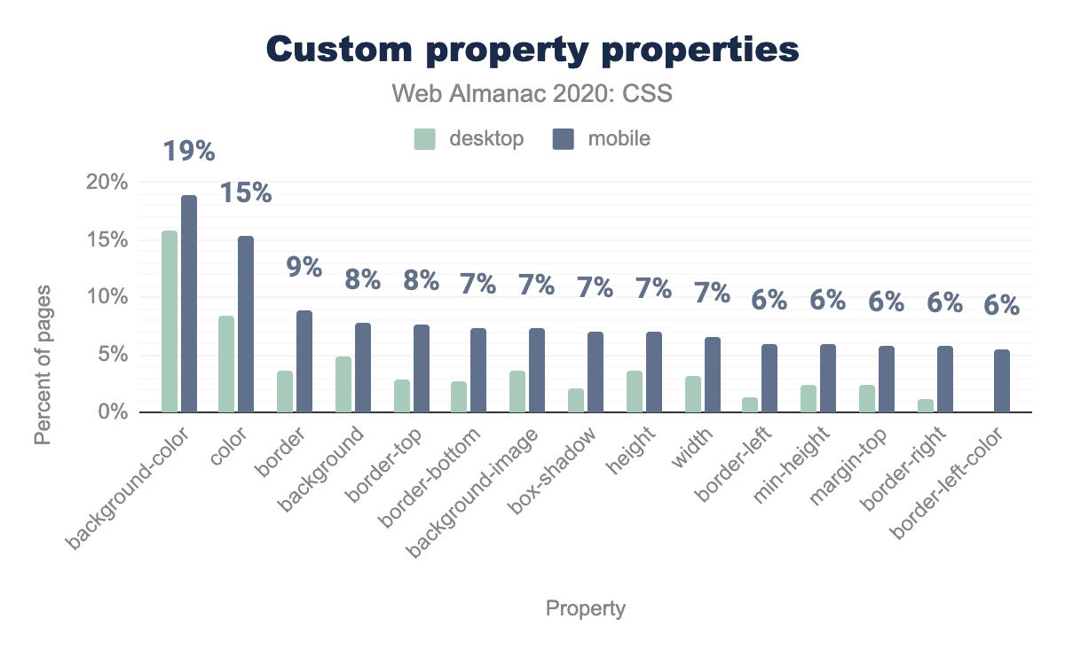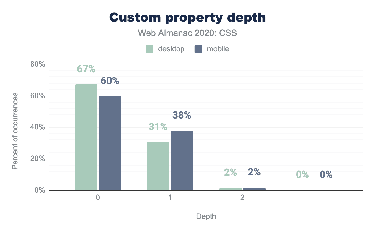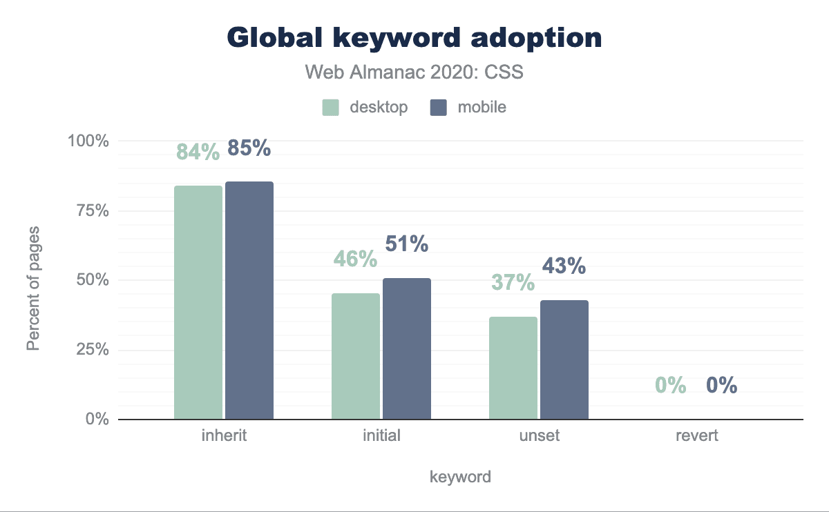 :rootは、その機能が正当化されるよりもはるかに人気があるようで、3分の1のページで使用されています。HTMLコンテンツでは、<html>要素を選択するだけなのに、なぜ開発者はhtmlを使わなかったのでしょうか? 考えられる答えは、:root擬似クラスへカスタムプロパティを定義することに関連した一般的な慣習にあるかもしれませんこれも非常によく使われています。もう1つの答えは特異性にあるかもしれません::rootは擬似クラスであるため、htmlよりも高い特異性を持っています。(0, 1, 0) 対 (0, 0, 1) です。例えば、:root .fooの特異度は (0, 2, 0) であるのに対し、.fooの特異度は (0, 1, 0) です。これは、カスケードレースの中でセレクターが他のセレクターよりもわずかに上を行くのに必要なことが多く、!importantのようなスレッジハンマーを避けるために必要なことです。この仮説を検証するために、私たちはまた、まさにこれを測定しました:子孫セレクターの先頭に:rootを使うページがどれくらいあるか? 結果は我々の仮説を検証しました:29%のページがそのように:rootを使用しています。さらにデスクトップページの14%とモバイルページの19%が、子孫セレクターの開始時にhtmlを使用しており、おそらくセレクターの特異性をさらに小さくするために使用していると思われます。これらの特異性ハックの人気は、開発者が!importantを介してそれらに与えられているものよりも特異性を微調整するためのより細かい制御を必要とすることを強く示しています。ありがたいことに、これは :where() でまもなく実現します。すでに 全面的に実装されています(今のところChromeではフラグの後ろに隠れていますが)。