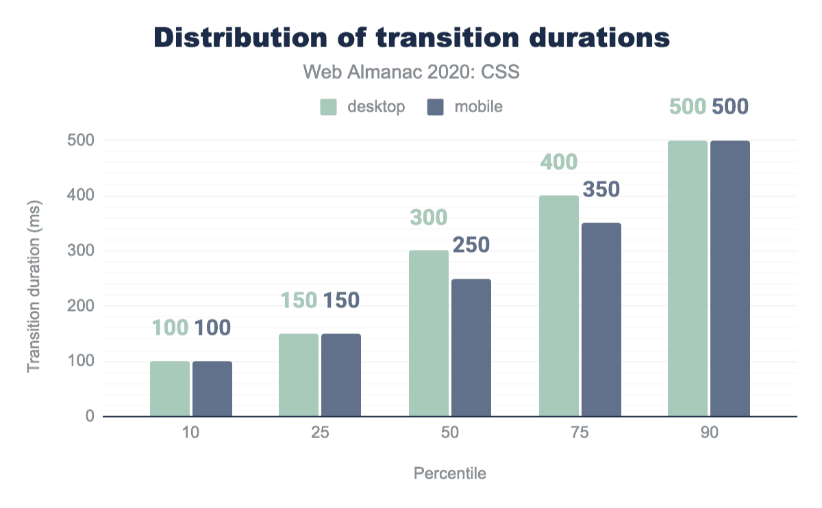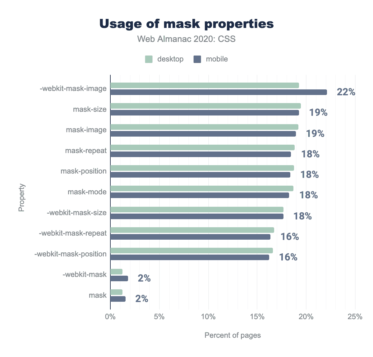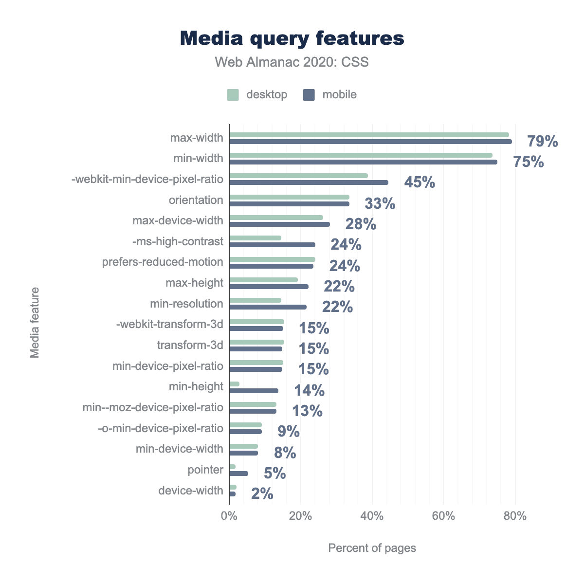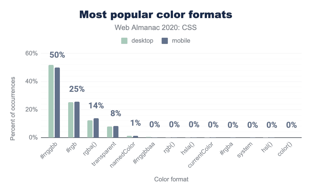 :rootは、その機能が正当化されるよりもはるかに人気があるようで、3分の1のページで使用されています。HTMLコンテンツでは、<html>要素を選択するだけなのに、なぜ開発者はhtmlを使わなかったのでしょうか? 考えられる答えは、:root擬似クラスへカスタムプロパティを定義することに関連した一般的な慣習にあるかもしれませんこれも非常によく使われています。もう1つの答えは特異性にあるかもしれません::rootは擬似クラスであるため、htmlよりも高い特異性を持っています。(0, 1, 0) 対 (0, 0, 1) です。例えば、:root .fooの特異度は (0, 2, 0) であるのに対し、.fooの特異度は (0, 1, 0) です。これは、カスケードレースの中でセレクターが他のセレクターよりもわずかに上を行くのに必要なことが多く、!importantのようなスレッジハンマーを避けるために必要なことです。この仮説を検証するために、私たちはまた、まさにこれを測定しました:子孫セレクターの先頭に:rootを使うページがどれくらいあるか? 結果は我々の仮説を検証しました:29%のページがそのように:rootを使用しています。さらにデスクトップページの14%とモバイルページの19%が、子孫セレクターの開始時にhtmlを使用しており、おそらくセレクターの特異性をさらに小さくするために使用していると思われます。これらの特異性ハックの人気は、開発者が!importantを介してそれらに与えられているものよりも特異性を微調整するためのより細かい制御を必要とすることを強く示しています。ありがたいことに、これは :where() でまもなく実現します。すでに 全面的に実装されています(今のところChromeではフラグの後ろに隠れていますが)。