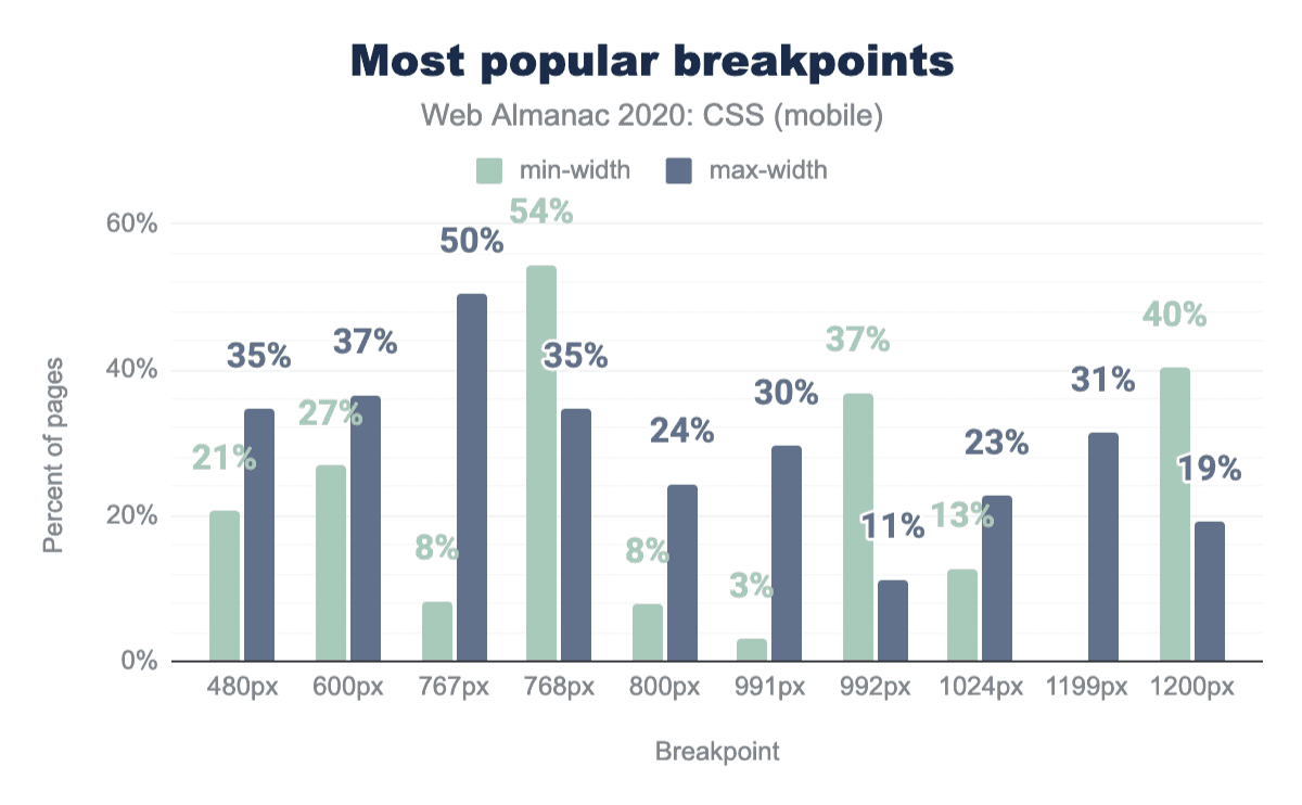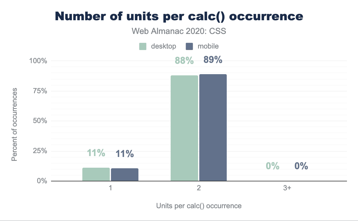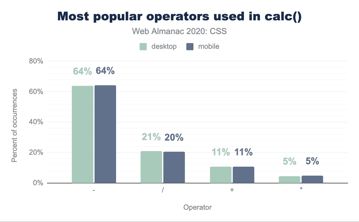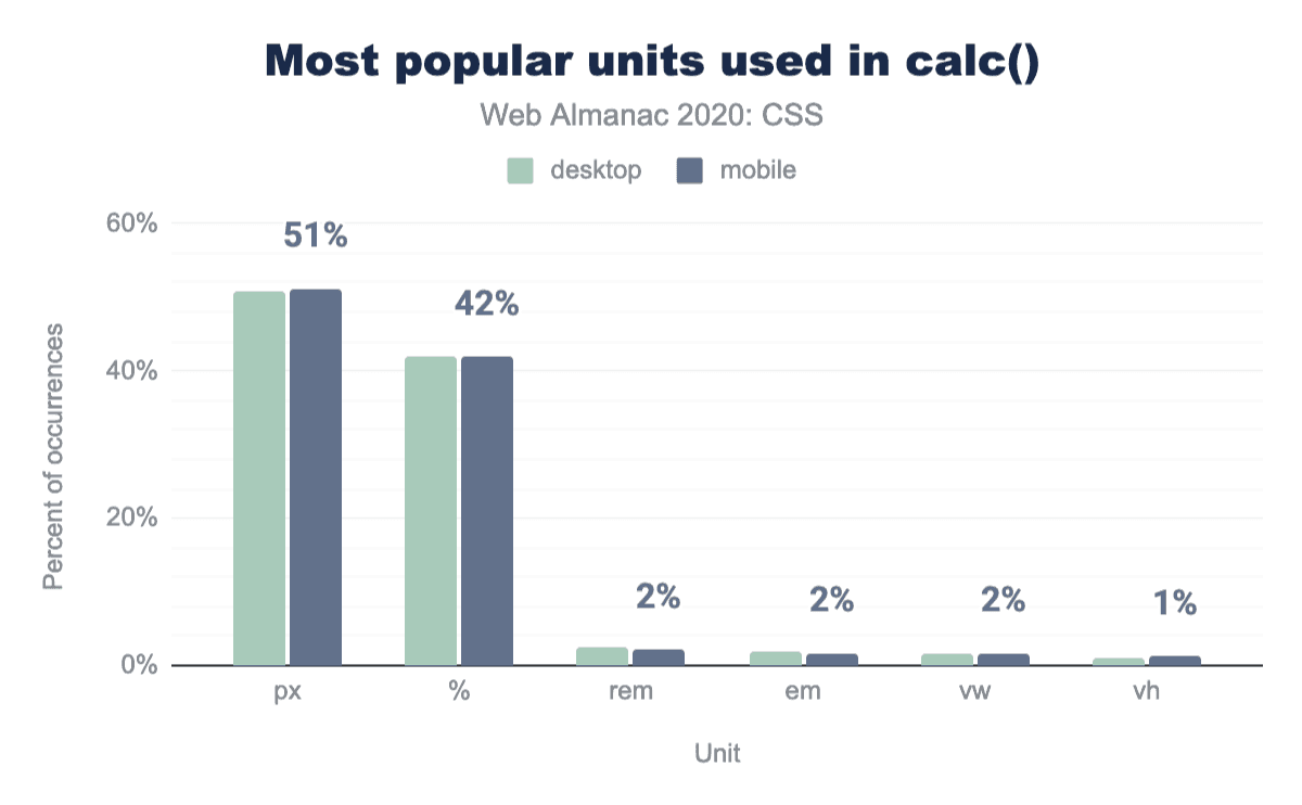 これは、calc()で最もよく使われる単位がpxcalc()の51%)と%calc()の42%)であり、calc()の64%が減算を含んでいることからも明らかなように、ほとんどがパーセントからピクセルを引くために使われているようです。興味深いことに、calc()で最も人気のある長さの単位は全体的に最も人気のある長さの単位とは異なります(例えば、emよりもremの方が人気があり、次いでビューポート単位が続きます)。