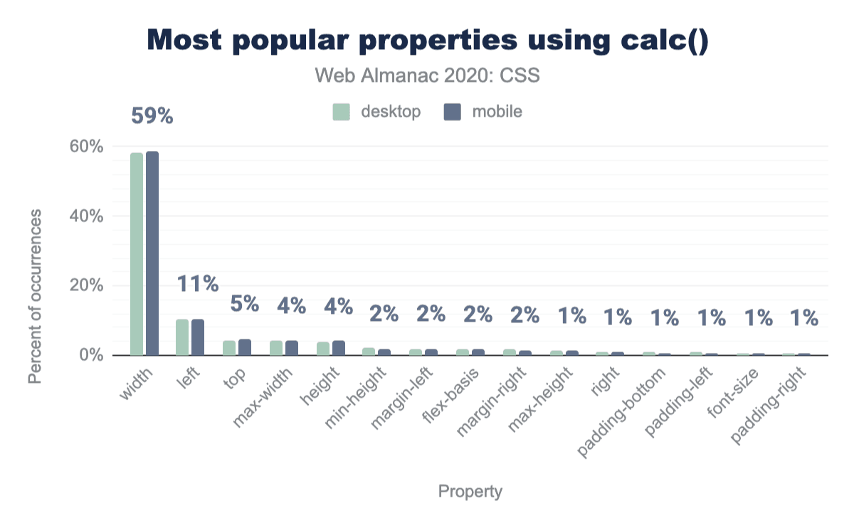 calc()は主に長さのために使われ、その96%は<length>値を受け付けるプロパティに集中しており、そのうちの60%(全体の58%)はwidthプロパティに使用されています!