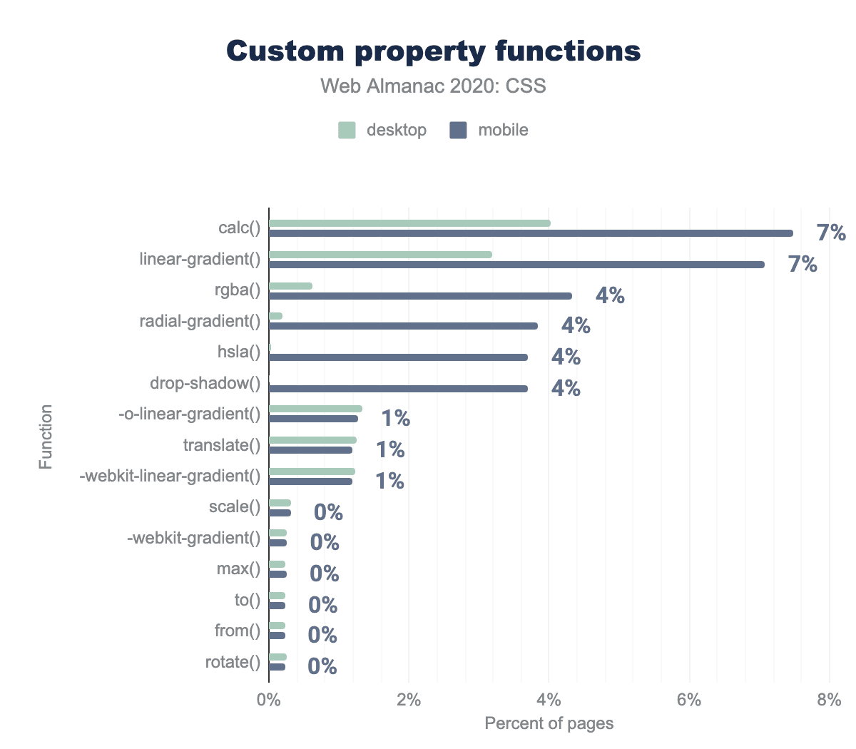 最後に、max()がすでに検出された機能のトップ10に入っており、デスクトップページの0.6%とモバイルページの0.7%で検出されていることは心強いことでした。max()(およびmin()clamp())‘) が 今年はボード全体でしかサポートされていなかったことを考えると、これは非常に印象的な採用であり、開発者がどれだけこの機能を必要としていたかを浮き彫りにしています。