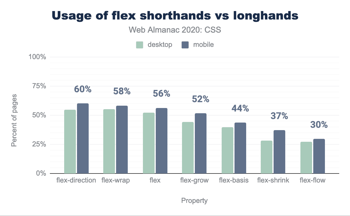 ほぼすべてのflex,flex-*プロパティは非常によく使われており、30~60%のページで使用されています。しかし、flex-wrapflex-directionの両方が、その短縮形であるflex-flowよりもはるかに多く使われています。flex-flowが使われるときは、2つの値、つまり両方の通常の記載を短く設定する方法として使われます。1つまたは2つの値でflexを使用するための精巧な賢明なデフォルトがあるにもかかわらず、使用の約90%は3つの値の構文で、3つの通常の記載を明示的に設定しています。
