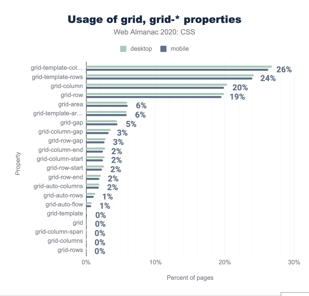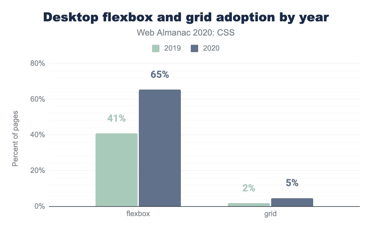 grid-templateの略語としてgrid-template-columns,grid-template-template-rows,grid-template-areasがあることをご存知でしょうか? また、gridプロパティがあり、それらはすべてその通常の記載の一部であることを知っていましたか? 知らないのですか? ほとんどの開発者はそうではありません。gridプロパティが使われたのは 5,279のウェブサイト(0.08%)で、grid-templateが使われたのは 8,215のウェブサイト(0.13%)だけでした。一方、grid-template-columnsは170万のウェブサイトで使用されており、その200倍以上も使用されています。