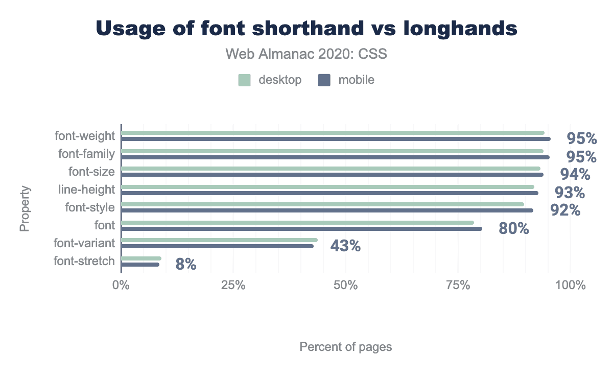 fontはかなり人気がありますが(80%のページで4,900万回使われています)、他のほとんどの通常の記載(font-variantfont-stretchを除く)に比べれば、ほとんど使われていません。これは、ほとんどの開発者がこの通常の記載を快適に使っていることを示しています (この通常の記載は非常に多くのウェブサイトで使われているので)。開発者はしばしば、子孫ルールで特定のタイポグラフィを上書きする必要がありますが、 それがなぜ通常の記載がこれほど多く使われているのかを説明しているのでしょう。