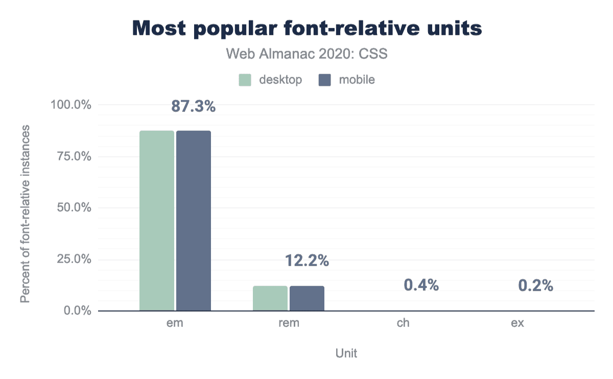 同様に、多くのユースケースでrememの優位性が大いに宣伝されており、ブラウザでの普遍的なサポートが 何年にもわたってされているにもかかわらず、ウェブはまだほとんど追いついていないのが現状です。野生ではch(’0’グリフの幅)とex(使用中のフォントのx-height)の使用も見られましたが、非常に小さいものでした(全フォント関係単位の0.37%と0.19%に過ぎませんでした)。