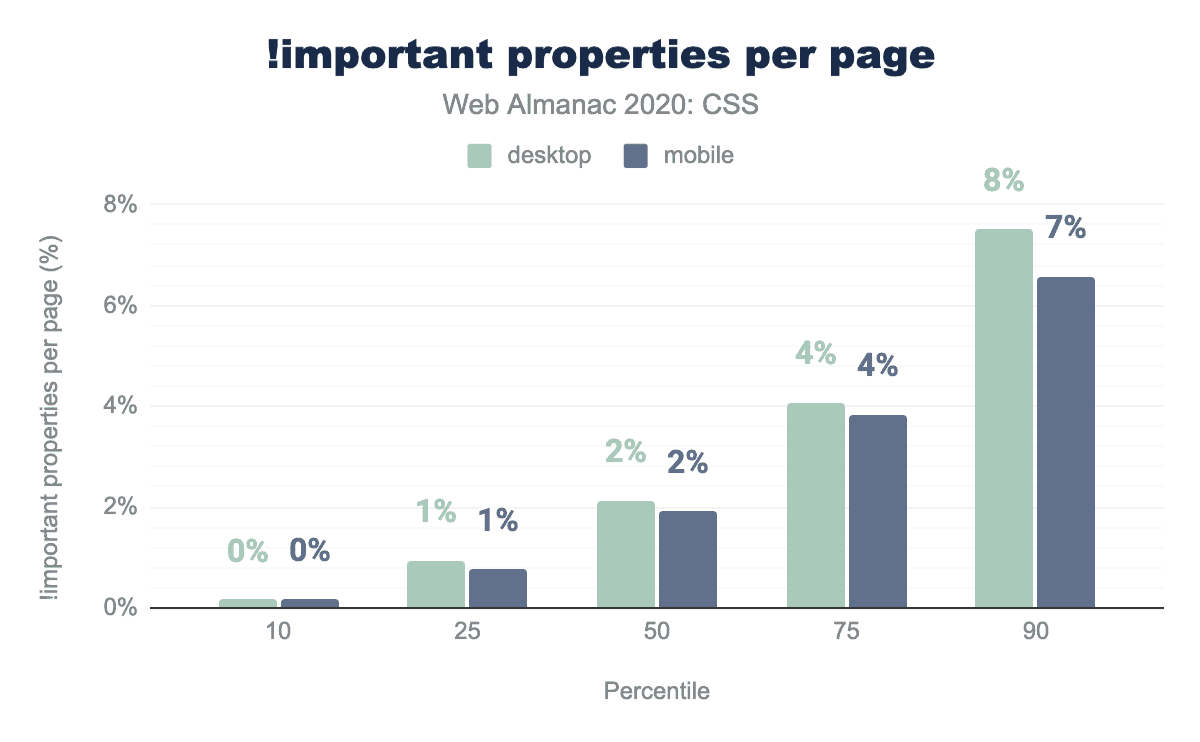 代わりに、古くて粗雑な!importantは、そのよく知られた欠点にもかかわらず、まだかなり使われています。中央値のページでは、宣言のほぼ2%、つまり50分の1で!importantが使用されています。