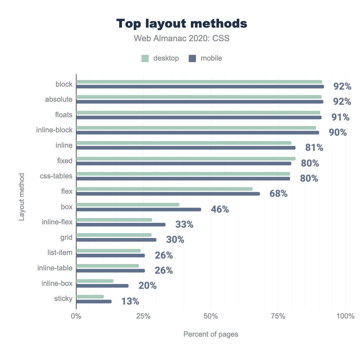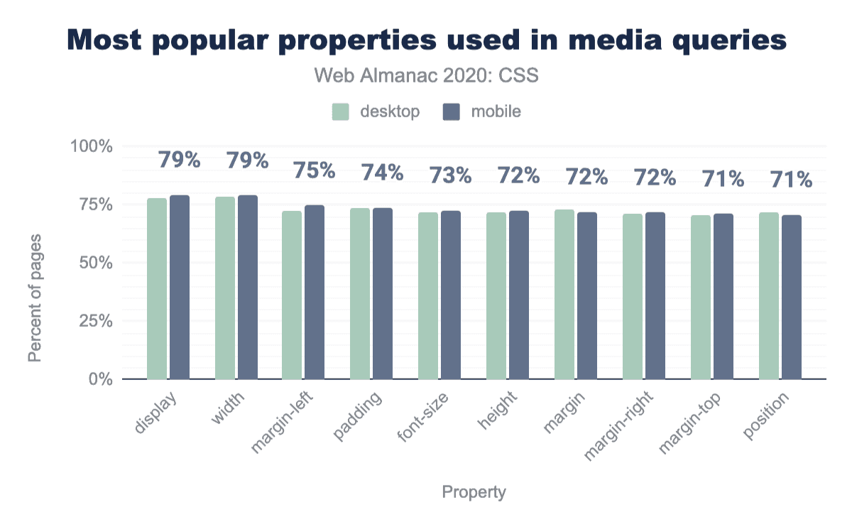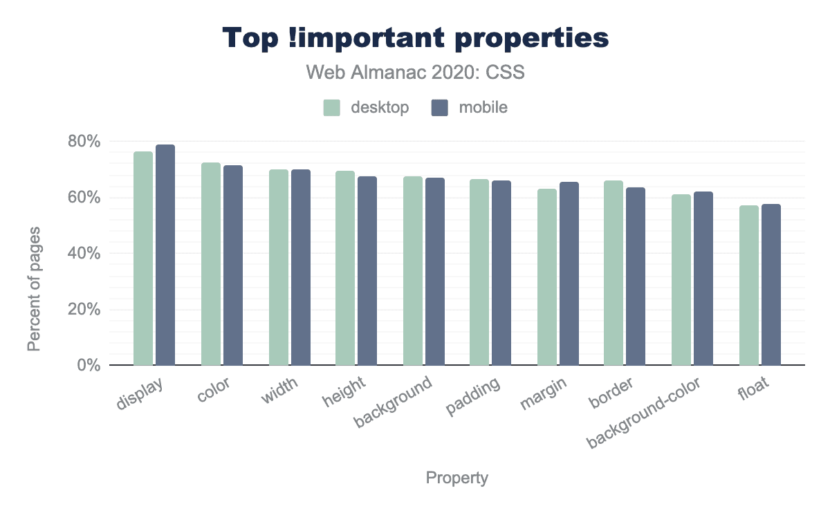開発者がオーバーライドすることに熱心なのは何ですか? プロパティごとの内訳を調べたところ、80%近くのページがdisplayプロパティで!importantを使用していることがわかりました。display:none !importantを適用してヘルパークラスのコンテンツを非表示にし、displayを使用してレイアウトモードを定義する既存のCSSをオーバーライドするのが一般的な戦略です。 これは、後から考えると、CSSの欠陥であったものの副作用です。 3つの直交する特性を1つに組み合わせました。内部レイアウトモード、フロー動作、および可視性ステータスはすべて、displayプロパティによって制御されます。これらの値を個別のdisplayキーワードに分けて、カスタムプロパティを介して個別に調整できるようにする努力がありますが、当分の間ブラウザのサポートは事実上存在しません