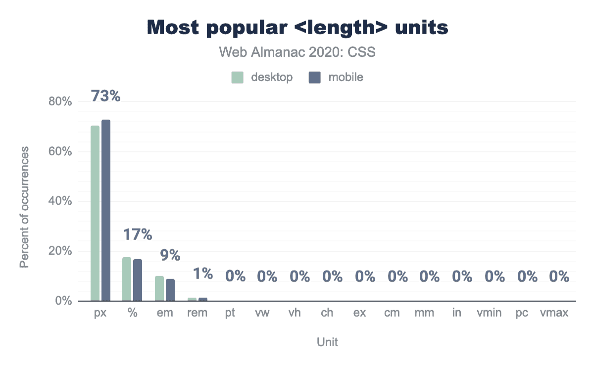 px単位は全体的に最も人気のある長さの単位であり、全スタイルシートの長さの72.58%がpxを使用しています。さらにパーセンテージを除外すると(パーセンテージは実際には単位ではないので)、pxのシェアはさらに増えて84.14%となっています。