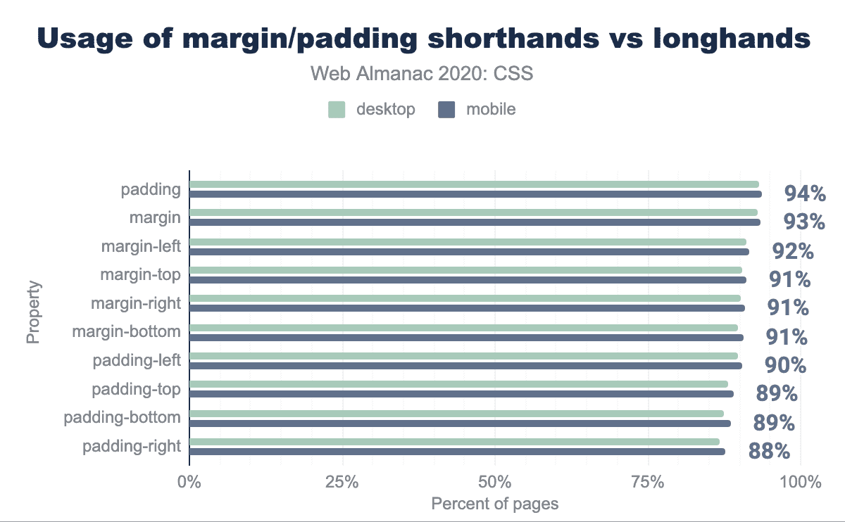 marginpaddingの両方の短縮形、およびそれらの通常の記載は、CSSプロパティの中で最もよく使用されているものの1つです。Paddingは短縮記号として指定される可能性がかなり高くなっています(paddingは150万回使用されているのに対し、それぞれの短縮記号は300~400万回使用されています)が、marginはあまり差がありません(marginは110万回使用されているのに対しそれぞれの短縮記号は500~800万回使用されています)。多くのCSS開発者がこれらの短縮形の値の時計回りの順序と、2つまたは3つの値の繰り返しルールについて最初は混乱していたことから、これらの短縮形の使用のほとんどは単純なもの(1つの値)になると予想していましたが、1,2,3,4つの値のすべての範囲を見ることができました。明らかに1や2の値の方が一般的ですが、3や4の値は全く珍しくなく、marginの25%以上、paddingの10%以上で使用されています。