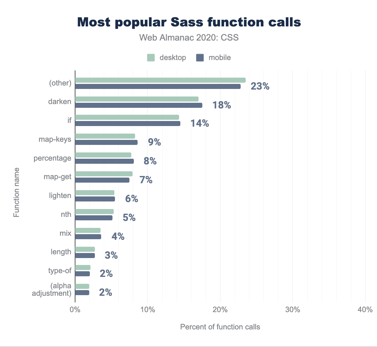 開発者が色修正機能を必要としていることは以前からわかっており、CSS Color 5で取り組んでいます。しかし、SCSSの関数呼び出しを解析することで、色修正関数がどれだけ必要かを証明するためのデータが得られ、またどのような種類の色修正が最も一般的に必要とされているかを知ることができます。