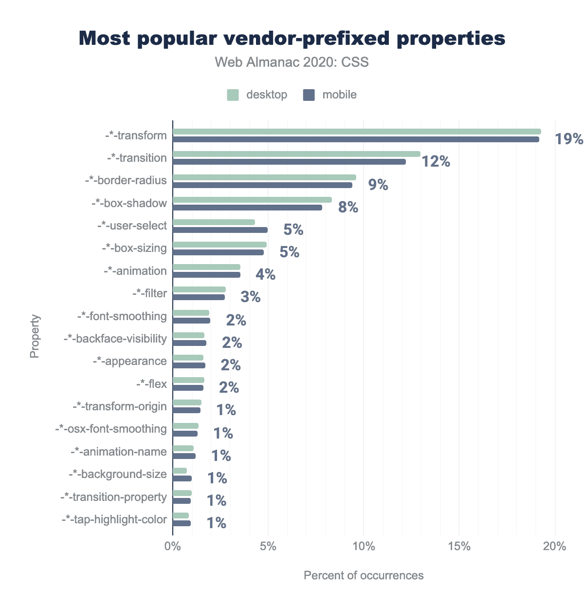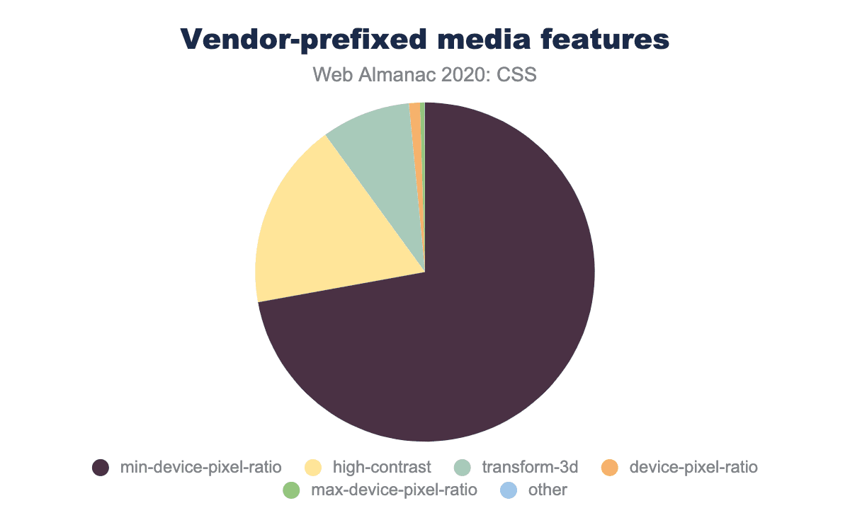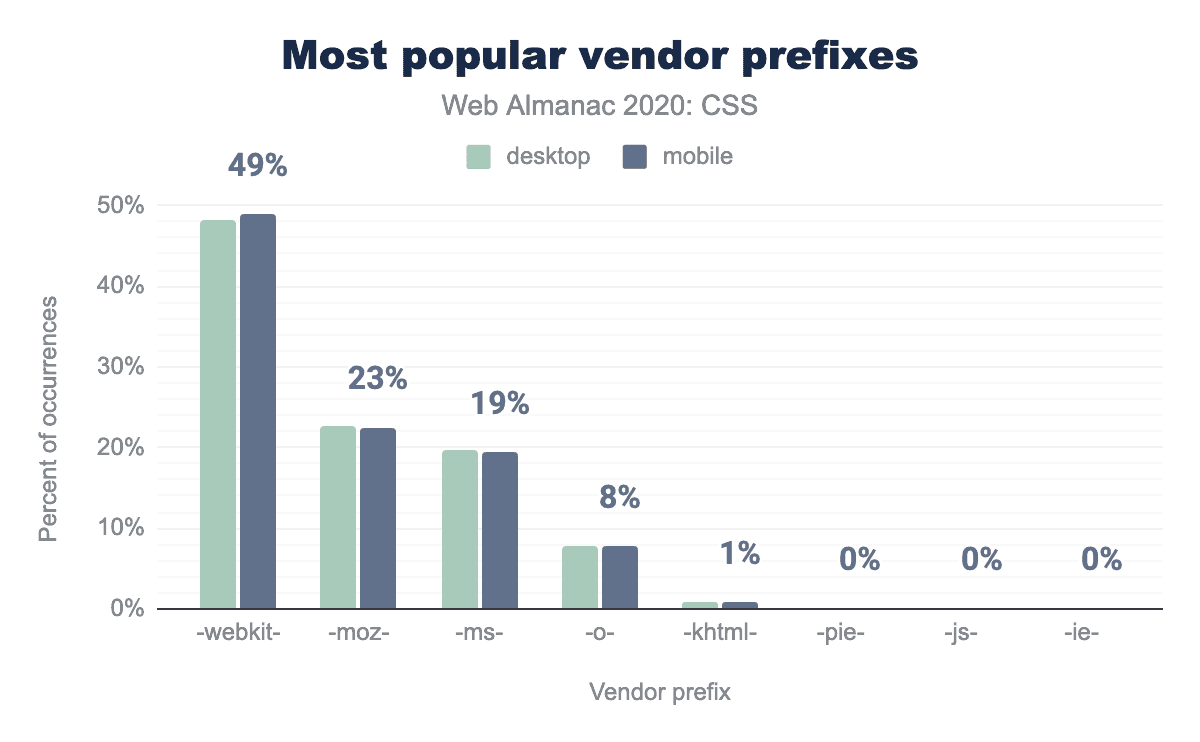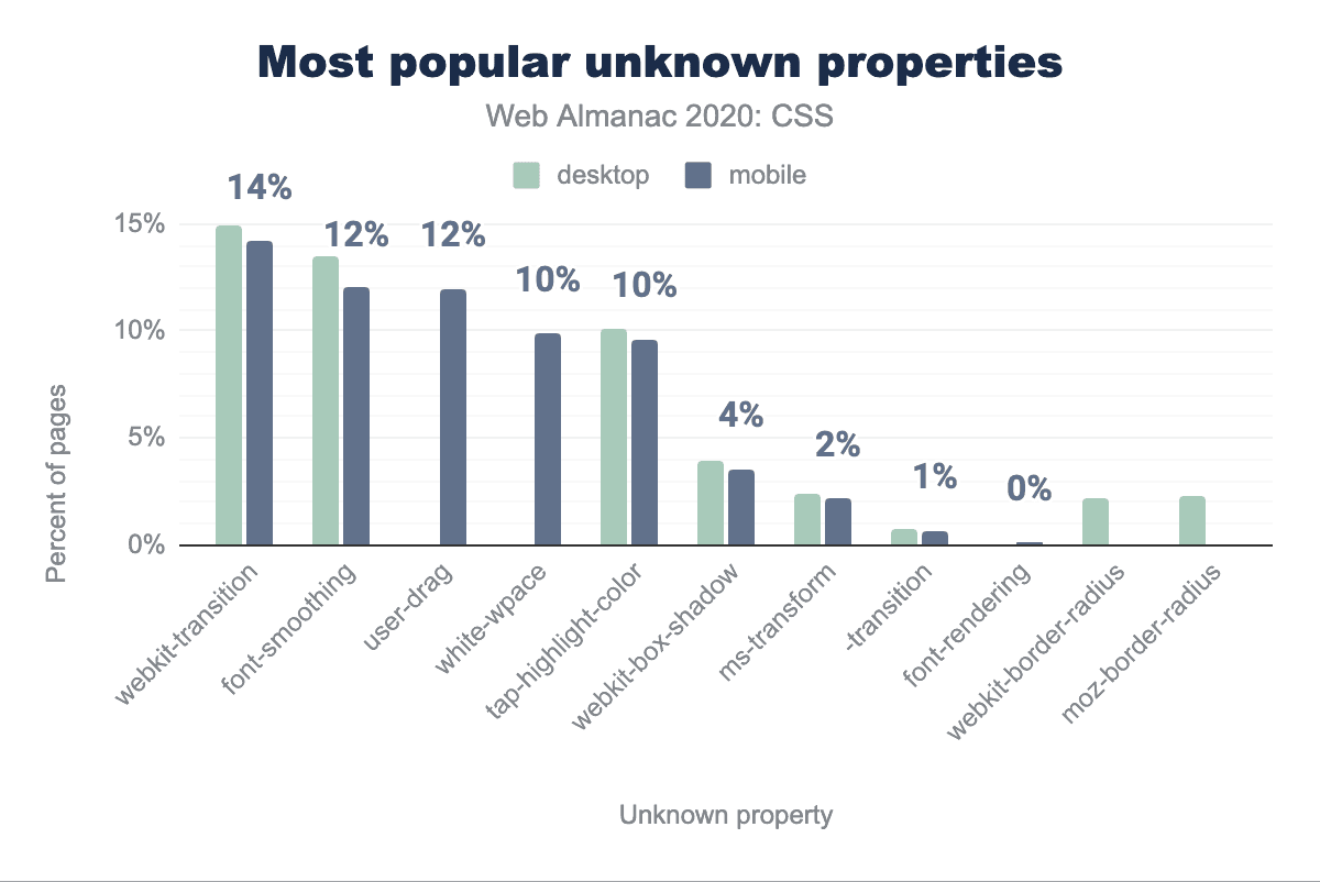 • 43%は接頭辞のみでしか存在しないプロパティの接頭辞なしの形式(例えば、font-smoothingは384Kのウェブサイトに登場しました)で、おそらく互換性のために、標準であるという誤った仮定の下で、あるいは標準になることを願って含まれていたのでしょう。
