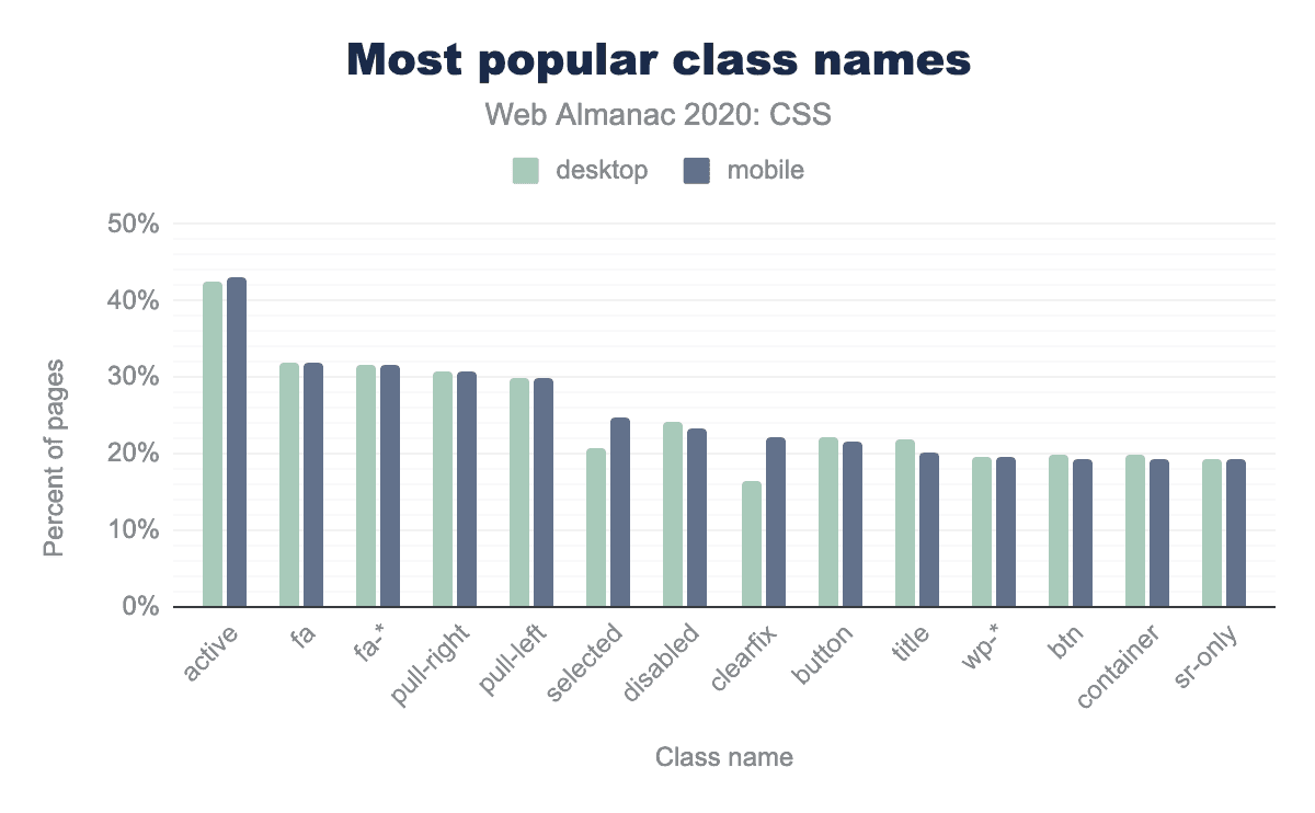 しかし、一度fa-*クラスとwp-*クラス(これも非常に人気のあるソフトウェアであるWordPressに由来する)を分解してみると、より意味のある結果が得られました。これらを省略すると、状態関連のクラスが最も人気があるようで、.activeが半数近くのウェブサイトで出現し、.selected.disabledがその直後に続いています。