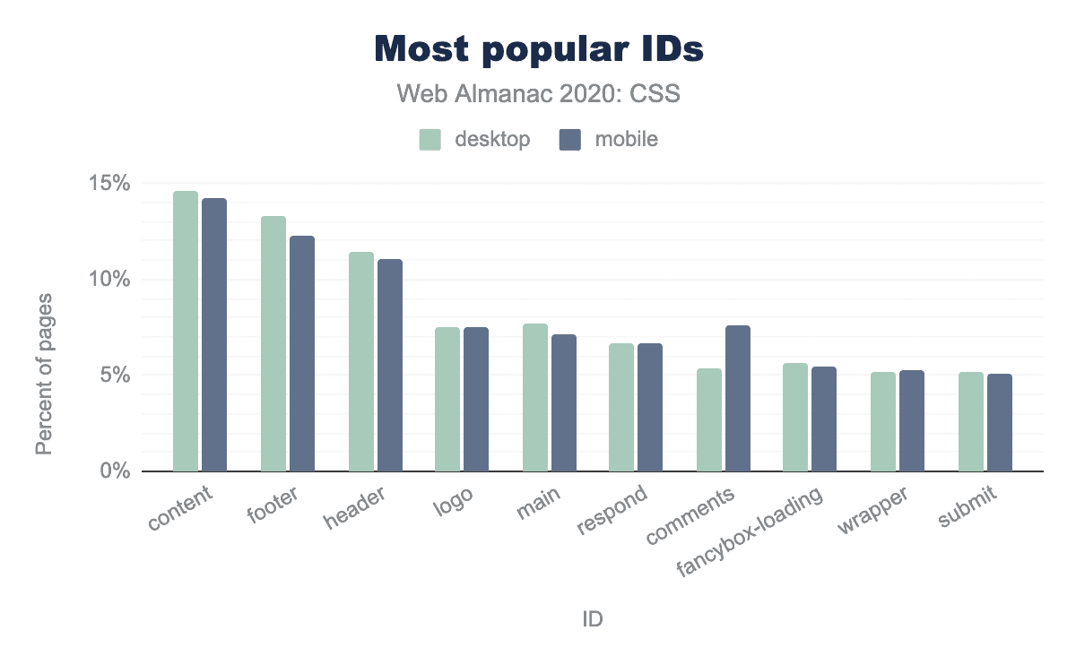 しかし、これらのIDは何に使われているのでしょうか? 最も人気のあるIDは構造的なものであることがわかりました:#content,#footer,#header,#mainですが、対応するHTML要素が存在するにもかかわらず、セレクターとして使用できます。