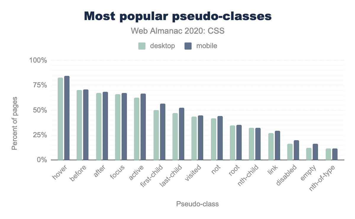 圧倒的に最も人気のある擬似クラスはユーザーアクションのもので、:hover,:focus,:activeがリストのトップにあり、すべてのページの3分の2以上で使用されていて、開発者が宣言的なUIインタラクションを指定できる利便性を気に入っていることがわかります。
