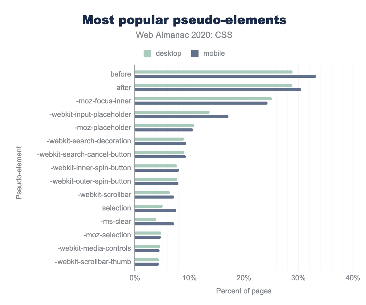 図1.14. ページ数に占める割合としては、最も人気のある疑似要素です。