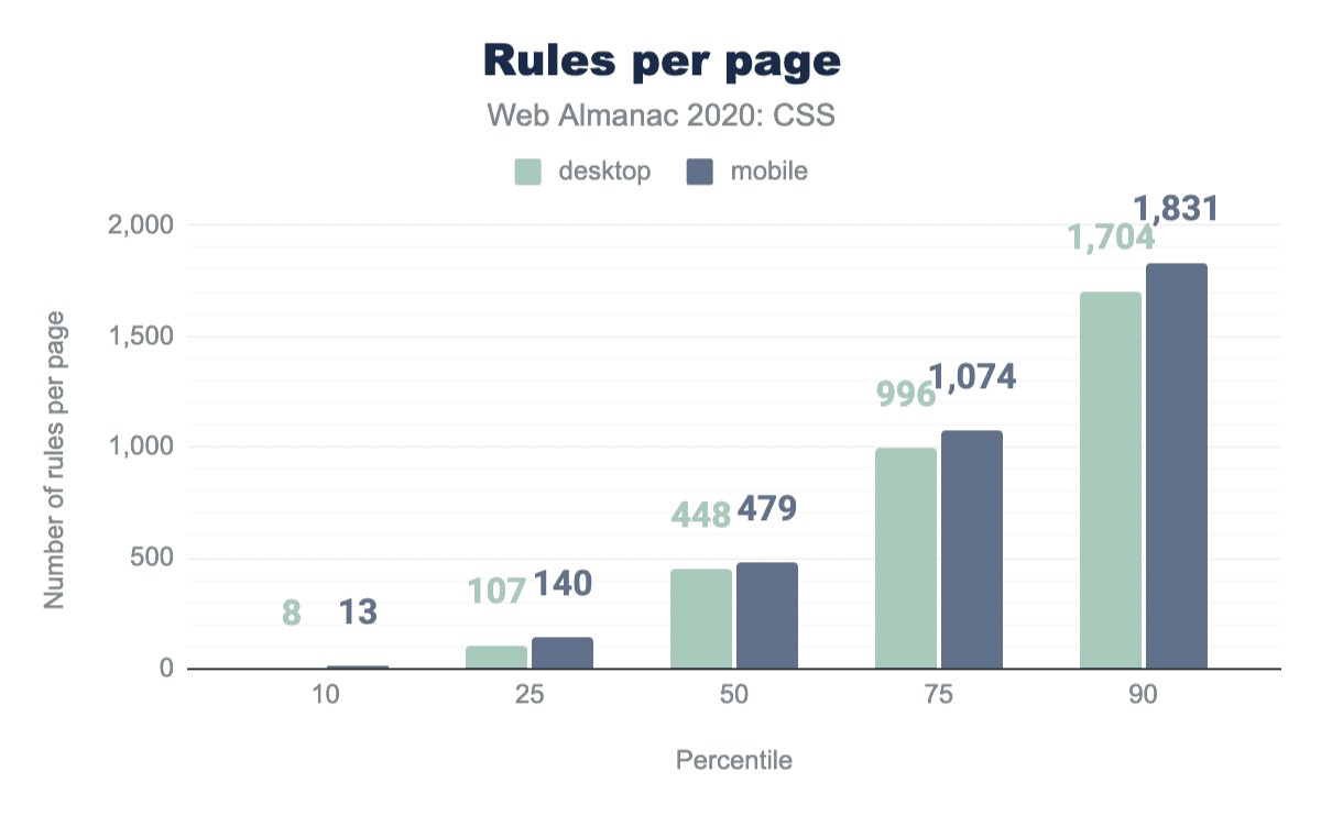 サイズのもう1つの指標は、ルールの数です。中央値のページには、合計448のルールと5,454の宣言が含まれています。興味深いことに、ページの10%はわずかな量のCSSを含んでおり、13のルールよりも少ないのです。モバイルの方がスタイルシートがわずかに小さいにもかかわらず、ルール数がわずかに多く、全体的にルールが小さいことを示しています(メディアクエリで起こりがちなことですが)。