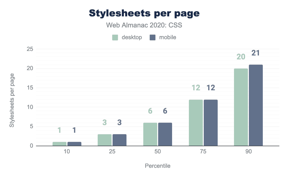 これらすべてのキロバイトのコードは、通常、複数のファイルと<style>要素に分散されています。実際、中央値のページには3つの<style>要素と6つのリモートスタイルシートがあり、そのうちの10%は14個の<style>要素と20個以上のリモートCSSファイルを持っています。これはデスクトップで最適ではありませんが、生のダウンロード速度よりも往復のレイテンシが重要なモバイルでは、パフォーマンスを本当に殺してしまいます。