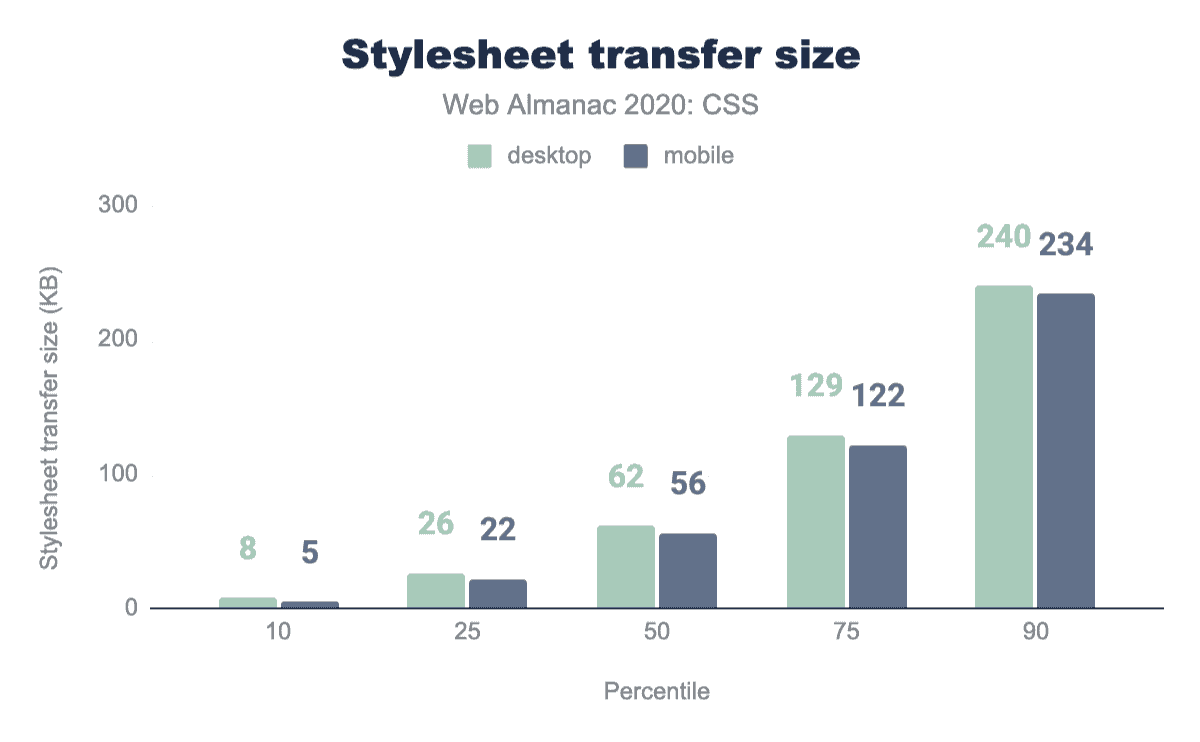 ページ重量のシェアではJavaScriptがCSSをはるかに上回っていますが、CSSのサイズは年々確実に大きくなっておりデスクトップページの中央値では62KBのCSSコードが読み込まれ、10ページに1ページが240KB以上のCSSコードを読み込んでいます。モバイルページでは、すべてのパーセンタイルでCSSコードの使用量がわずかに減少していますが、その差は4~7KBにとどまっています。これは間違いなく過去数年よりも多いですが、[JavaScriptの中央値444KBと1.2MBのトップ10%]には及ばないですね(./javascript#how-much-javascript-do-we-use)