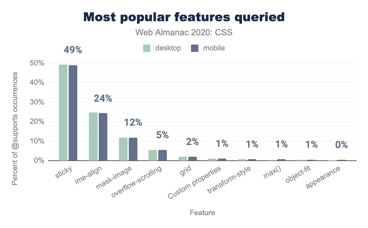しかし、それらは何のために使用されているのでしょうか?我々は、最も人気のあるクエリを見てみました。結果は意外なものでした。グリッド関連のクエリがトップになると思っていたのですが、圧倒的に人気のある機能クエリはposition: stickyのものでした。これはフィーチャークエリ全体の半分を占め、約4分の1のページで使用されています。対照的に、グリッド関連のクエリは全クエリの2%に過ぎず、開発者はグリッドのブラウザサポートが十分に快適であると感じているため、グリッドの機能強化としてだけ使用する必要はないことを示しています。