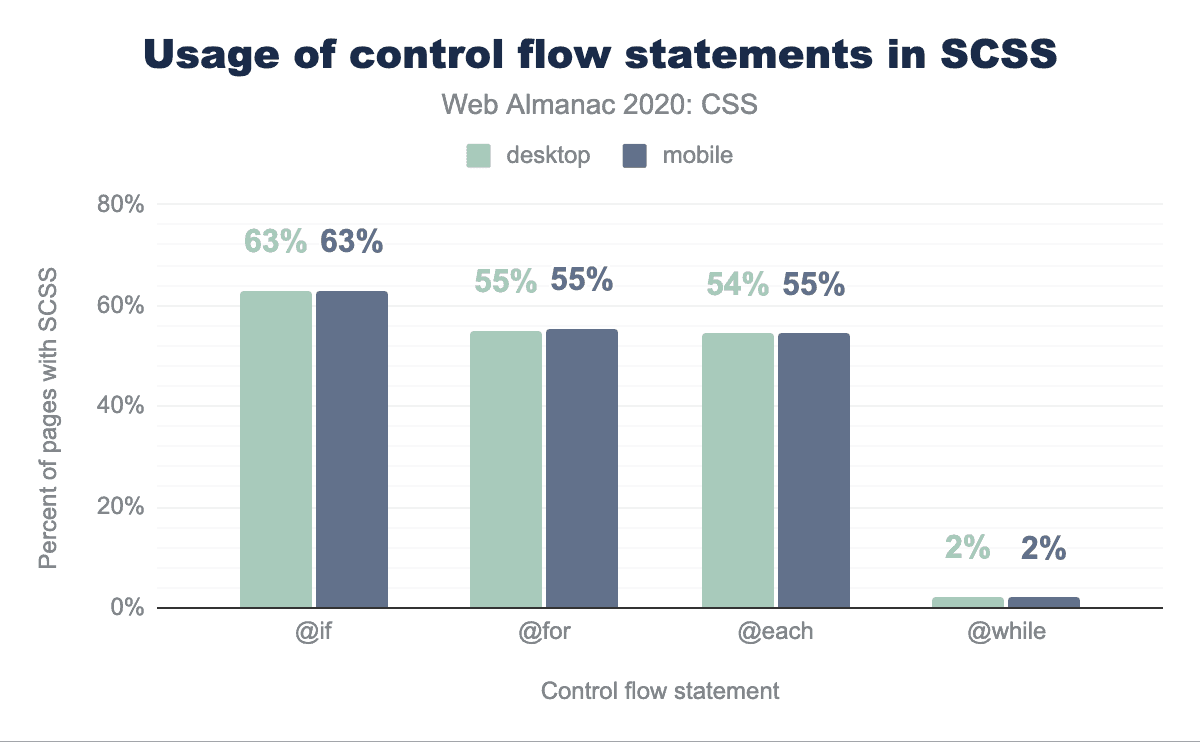 また、CSS WGでは限定的な条件式の導入について最近議論が行われており、Sassではこれがどのくらいの頻度で必要とされているかについてのデータを提供してくれています。SCSSのシートのほぼ3分の2が少なくとも1つの@ifブロックを含んでおり、すべての制御フロー文のほぼ3分の2を占めています。また、値内の条件式のためのif()関数もあり、これは全体で2番目によく使われる関数です(14%)。