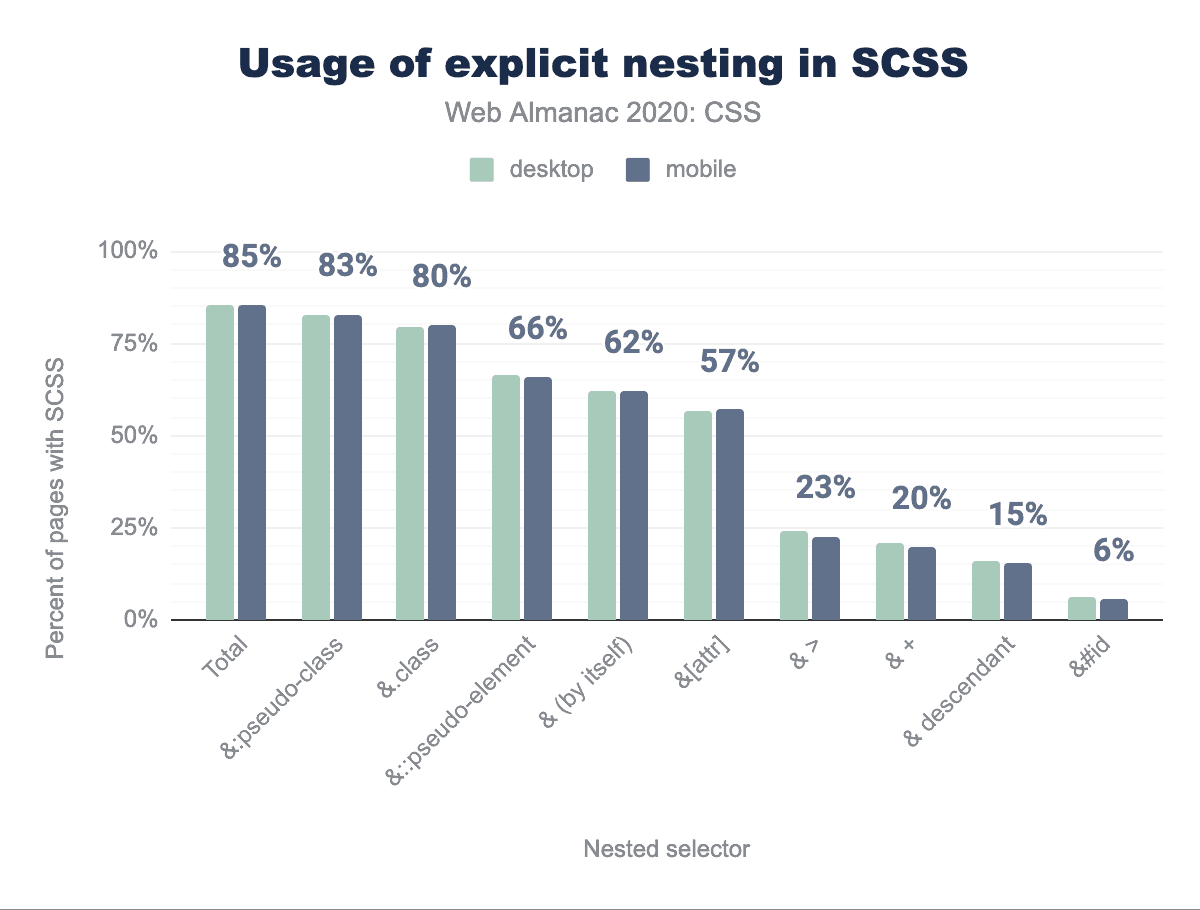 これは、Sassや他のプリプロセッサで&を使ってできることと同様に、他のルールの中にルールを入れ子にできます。SCSSシートでネスティングはどのくらい一般的に使われているのでしょうか? 非常によく使われています。SCSSシートの大部分は、少なくとも1つの明示的に入れ子にしたセレクタを使用しており、擬似クラス(例:&:hover)とクラス(例:&.active)がそのうちの4分の3を占めています。また、子孫が想定され、&文字が不要な暗黙の入れ子は考慮されていません。