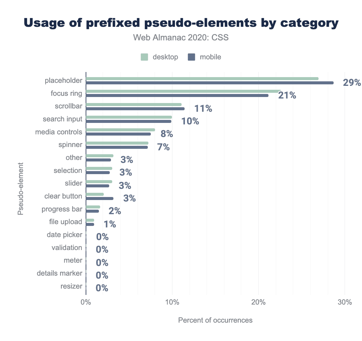 疑似要素に関しては通常の疑似要素である::before::afterに続いて、人気のある疑似要素のほとんどは、フォームコントロールやその他の組み込みUIをスタイリングするためのブラウザ拡張機能であり、組み込みUIのスタイリングをより細かく制御したいという開発者のニーズを強く反映しています。フォーカスリング、プレースホルダー、検索入力、スピナー、選択、スクロールバー、メディアコントロールのスタイリングは特に人気がありました。