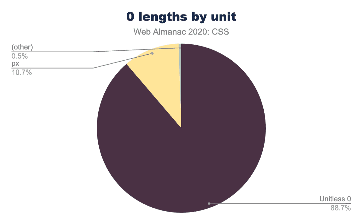 つまり、0px0emなどの代わりに0と書くことができます。開発者(あるいはCSSのミニファイヤー?)はこれを広く利用しています。すべての0値のうち、89%は単位がありませんでした。