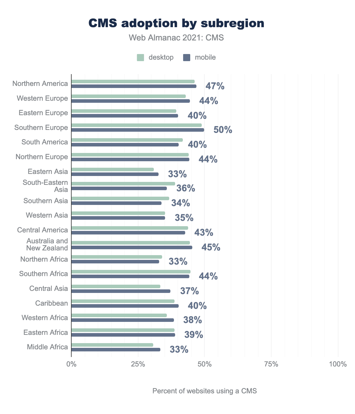 導入がもっとも進んでいるのは南欧で、半数のサイトがCMSを使用しています。一方、もっとも進んでいないのは東アジアで、データセット中のサイトの3分の1しかCMSを使用していません。