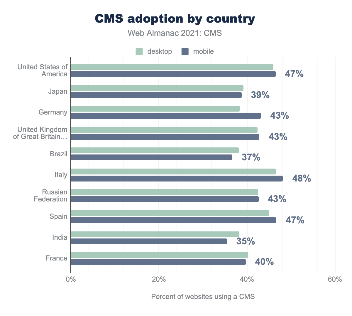 ウェブサイト数が多い地域の中で、CMSの採用率がもっとも高いのは米国、イタリア、スペインで、ユーザーが訪問したモバイルサイトの46%~47%がCMSで構築されています。インドとブラジルはもっとも低く、それぞれ35%と37%にとどまっています。