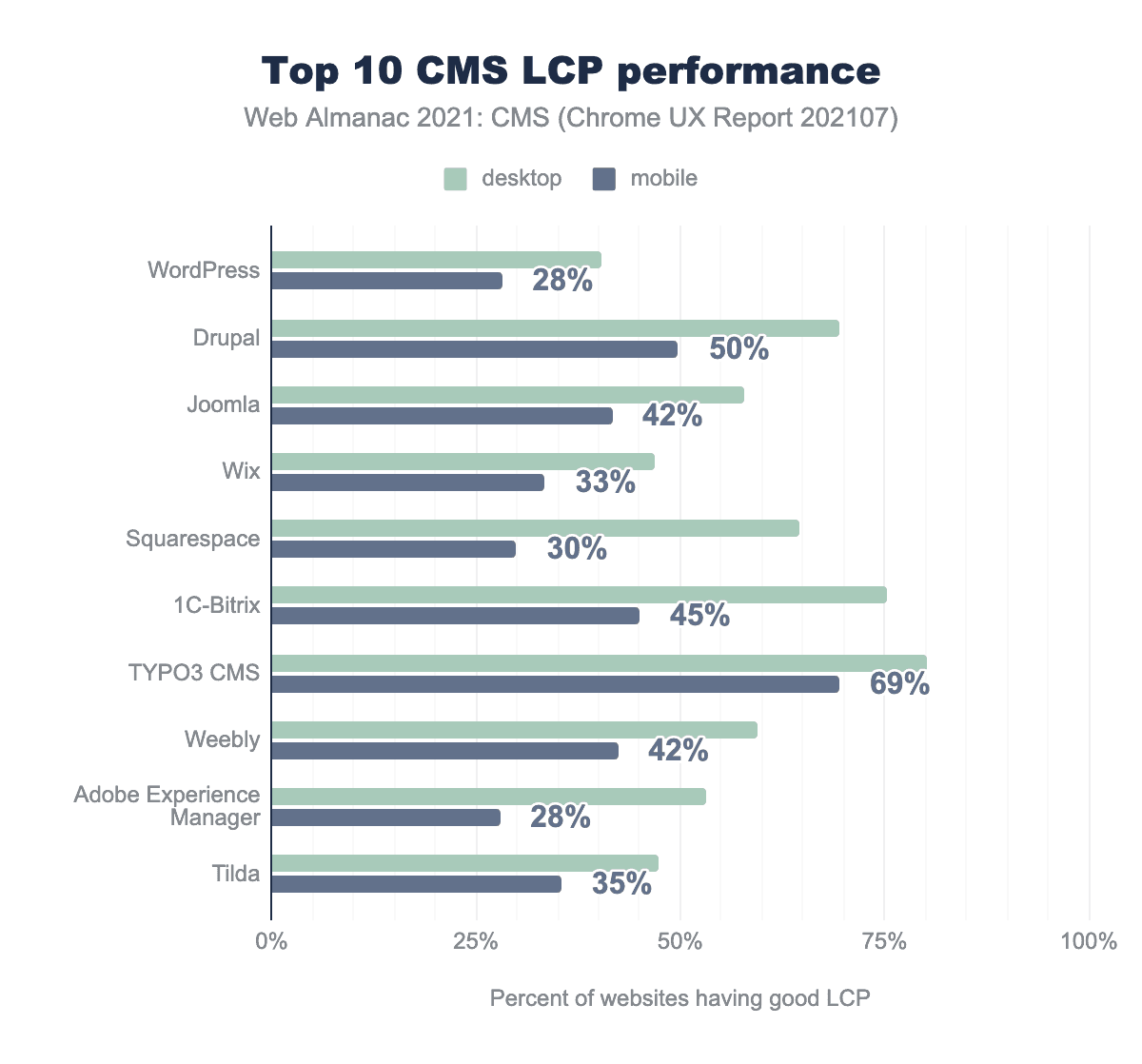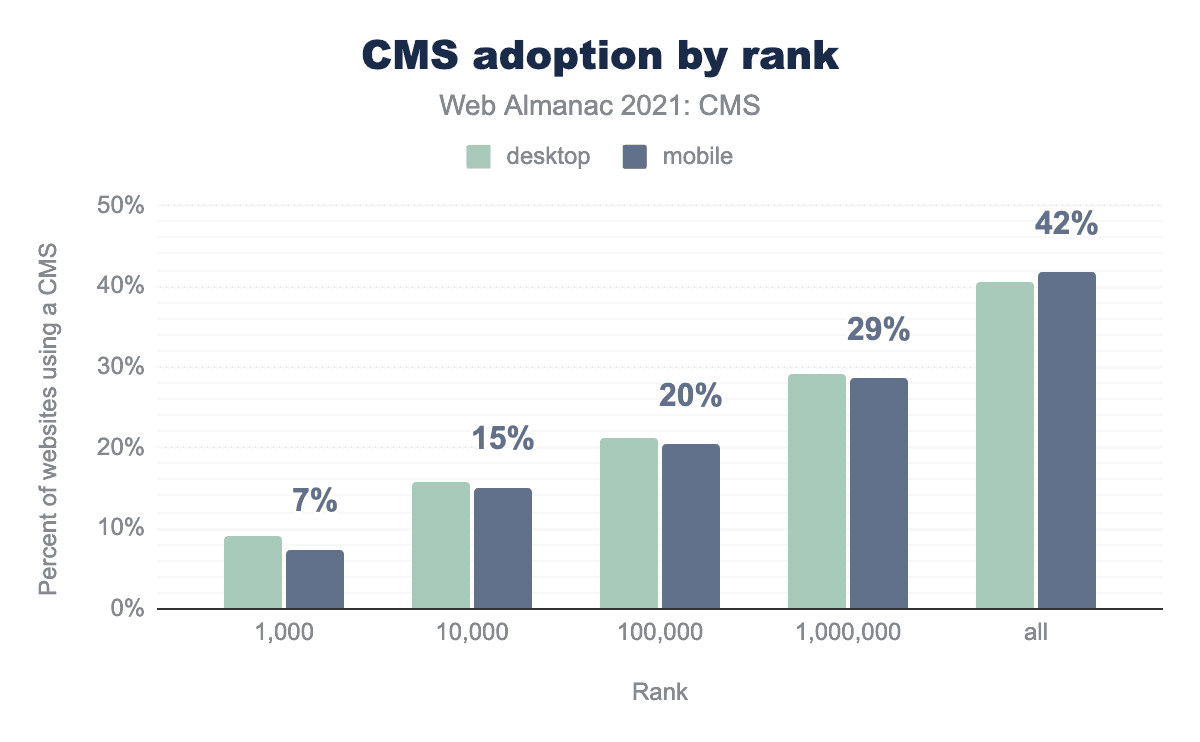 2021年7月時点で、公共サイトの45%以上がCMSプラットフォームを採用しており、2020年から7%以上の成長を示しています。その内訳は、デスクトップが2019年の42%から45%、モバイルが2020年の42%から46%となっています。