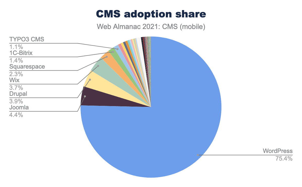 WordPressは現在もっともよく使われているCMSで、CMSで構築されたサイトのほぼ4分の3がWordPressを使用しているので、さらに議論する必要があります。