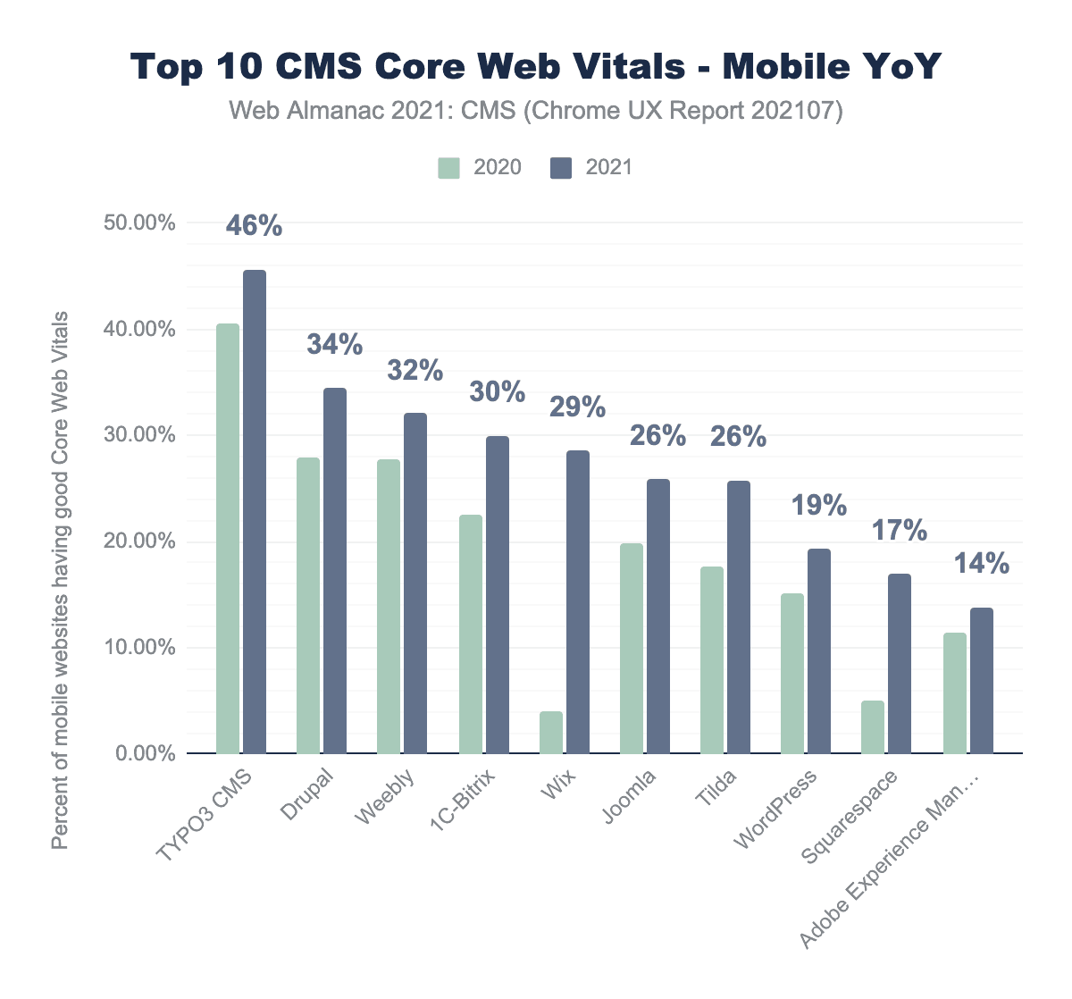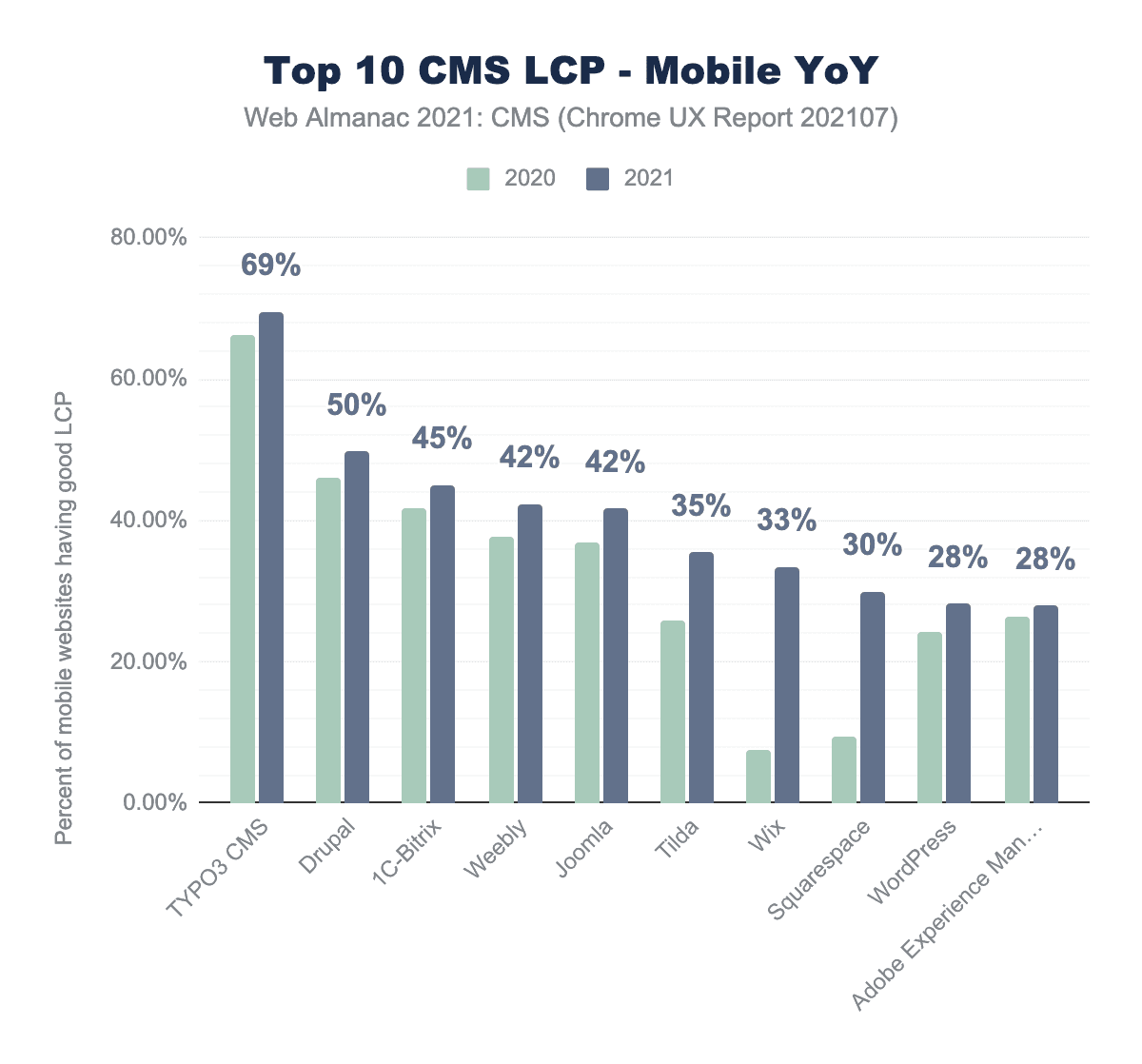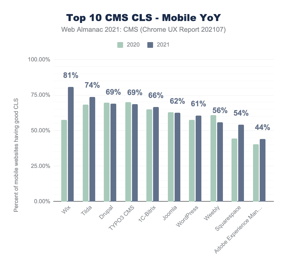 年間のデータを比較すると、ほとんどのCMSが何らかの進歩を遂げ、あるいはウィンドウズCLSメトリックスへの変更によって恩恵を受けたことがわかります。しかし、Weeblyのような特定のCMSは、過去1年間でCLSのスコアが後退していることがわかります。