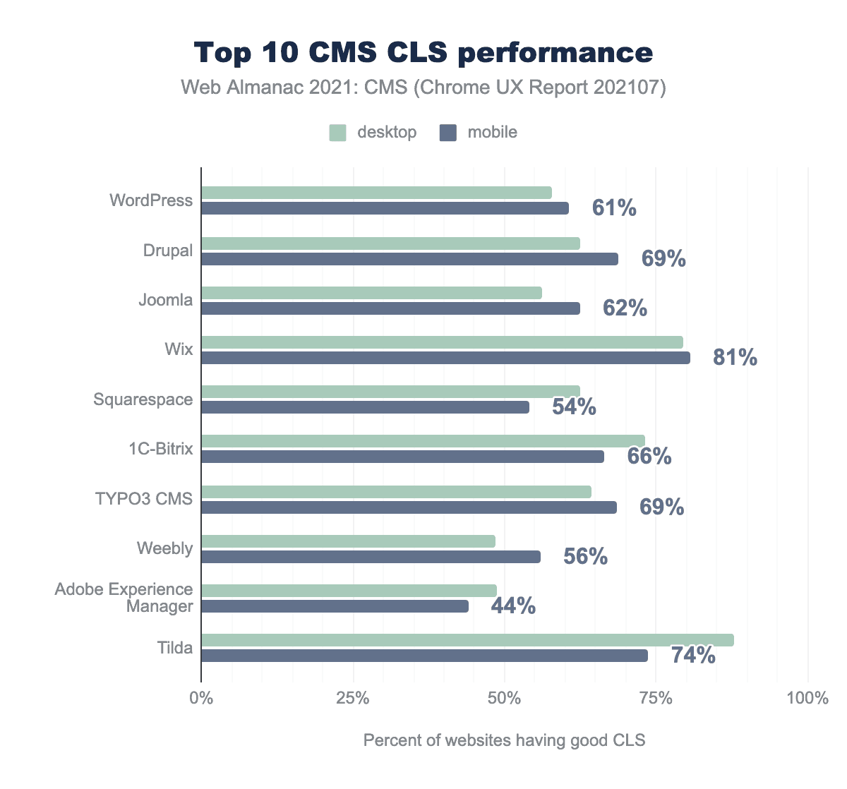 WixのCLSスコアはもっとも高く、モバイル端末の81%が「良い」CLSを獲得しています。AdobeエクスペリエンスマネージャーのCLSスコアはもっとも低く、モバイル端末の44%が「良い」CLSを獲得しているに過ぎません。レイアウトのずれは接続速度にかかわらず通常は避けることができるので、すべてのプラットフォームは、レイアウトのずれを最小限に抑えることによって、これらの数値を改善するよう努力する必要があります。