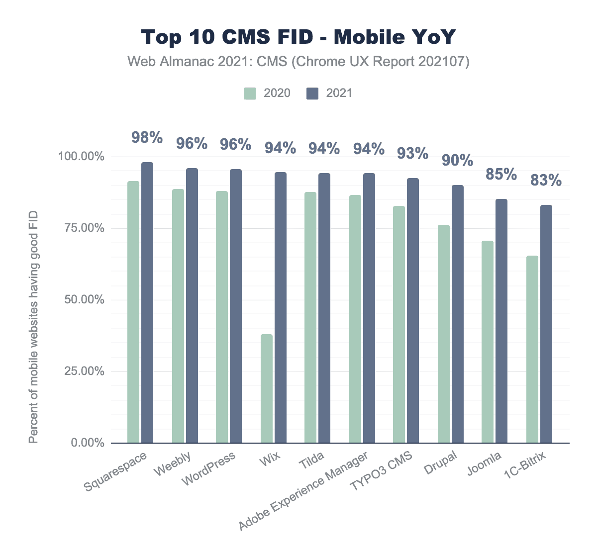 年間データを見ると、これらのCMSはすべて過去1年間にFIDを改善することができました。WixはFIDでもっとも追いつく必要があり、かなり数字を伸ばしました。JoomlaとBitrixは今年もっとも低いFIDスコアでしたが、それでも改善することができました。