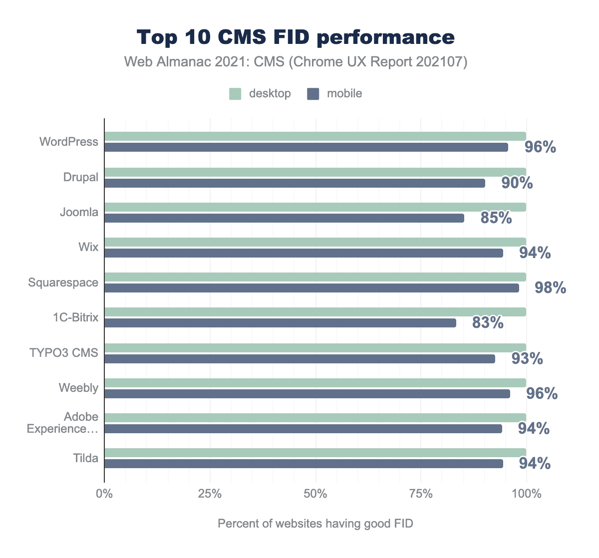 デスクトップでは、ほとんどのCMSでFIDは非常に良好で、すべてのプラットフォームで100%のスコアを獲得しています。ほとんどのCMSはモバイルでも90%以上の良好なFIDを実現していますが、BitrixとJoomlaは83%と85%のオリジンしか良好なFIDを実現していません。