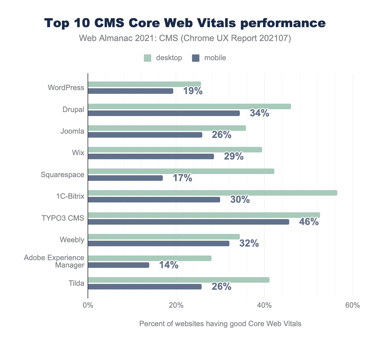 デスクトップ端末の体験はやや良好で、1C-Bitrix(主にロシアで使用)は、CWVを通過したサイトの割合が56%ともっとも高かった。WordPressは合格率がもっとも低く、26%にとどまりました。