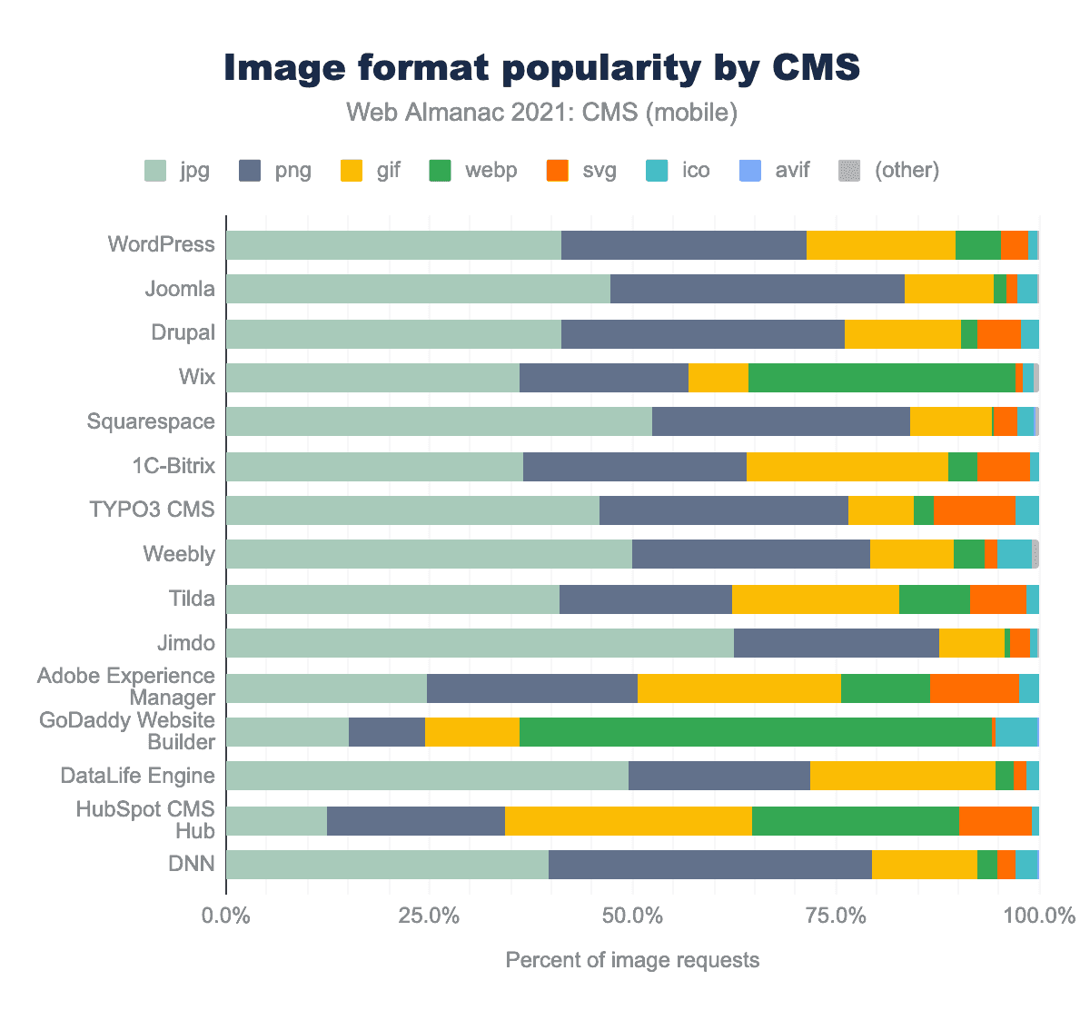 トップクラスのCMSにおける、さまざまな画像フォーマットの使用状況を調べることができます。