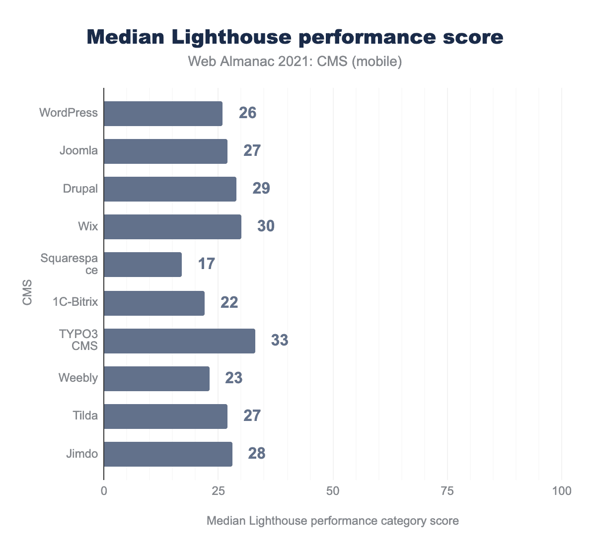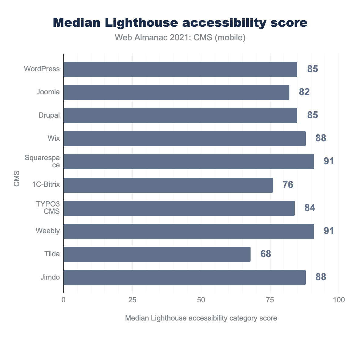 上位10社のCMSのLighthouseアクセシビリティスコアの中央値は、76から91の間です。SquarespaceとWeeblyのスコアが91ともっとも高く、Tildaはもっとも低いアクセシビリティスコアでした。