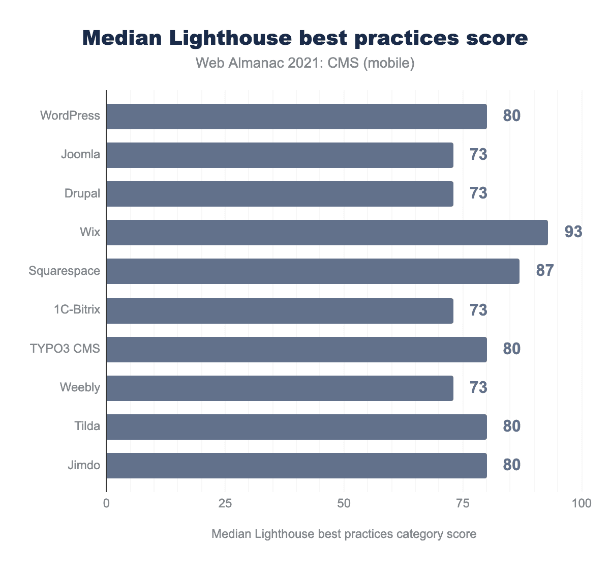 Wixはベストプラクティスの中央値が93ともっとも高く、他のトップ10のプラットフォームの多くは73ともっとも低いスコアを共有しています。